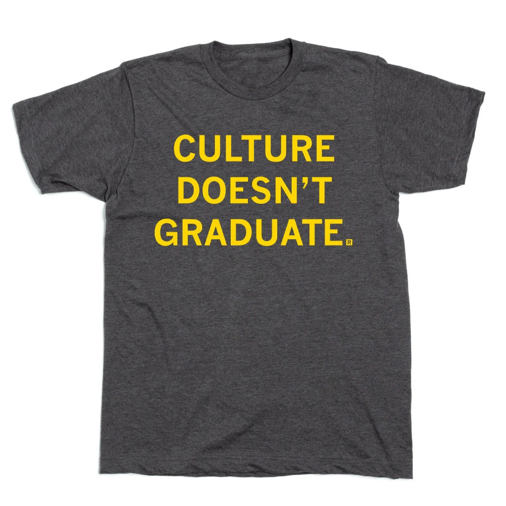 Culture Doesn’t Graduate. A Portion of All RAYGUN Sales Raise Money For Organizations That We Support. Golden Yellow Screen Print on a Charcoal T-shirt (50% Combed Ringspun Cotton / 50% Polyester). Cut & sewn sweatshop free. Designed and Printed by Union Labor at RAYGUN.
