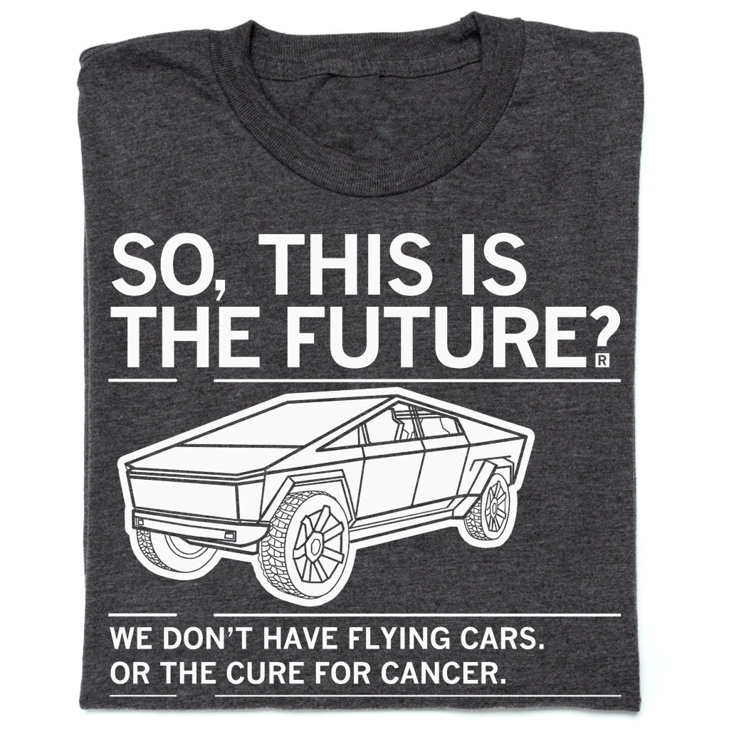 So, This Is The Future? We Don’t Have Flying Cars. Or The Cure For Cancer. A Portion of All RAYGUN Sales Raise Money For Organizations That We Support. White Screen Print on a Charcoal T-shirt (50% Combed Ringspun Cotton / 50% Polyester). Cut & sewn sweatshop free. Designed and Printed by Union Labor at RAYGUN.