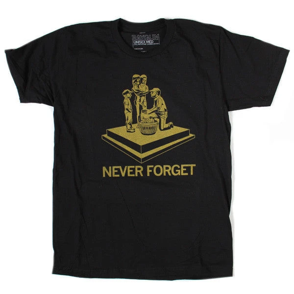 Never Forget! This Design Has Been Retired and is No Longer Available on Our Sales Floors But Can Be Ordered Here Online! Since All of Our Retired Designs Are Printed on Demand, Please Allow For a Couple Extra Days Before Shipping. A Portion of All Raygun Sales Raise Money For Organizations That We Support. Gold Screen Print on a Black T-Shirt (100% Combed Ringspun Cotton). Cut and sewn sweatshop free. Designed and printed by Union Labor at RAYGUN.