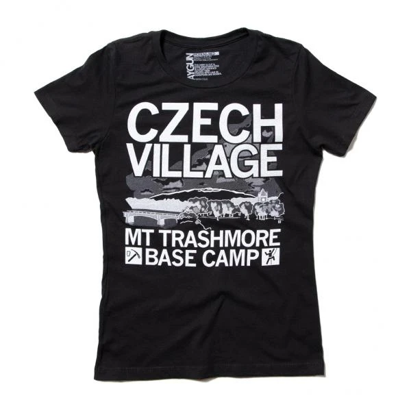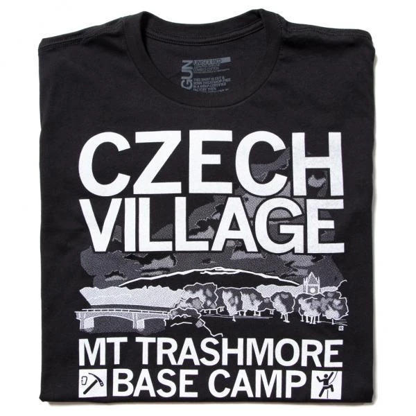 Czech Village: Mount Trashmore Basecamp. This Design Has Been Retired and is No Longer Available on Our Sales Floors But Can Be Ordered Here Online! Since All of Our Retired Designs Are Printed on Demand, Please Allow For a Couple Extra Days Before Shipping. A Portion of All Raygun Sales Raise Money For Organizations That We Support. White Screen Print on a Black T-shirt (100% Combed Ringspun Cotton).Cut and sewn sweatshop free. Designed and printed by Union Labor at RAYGUN.