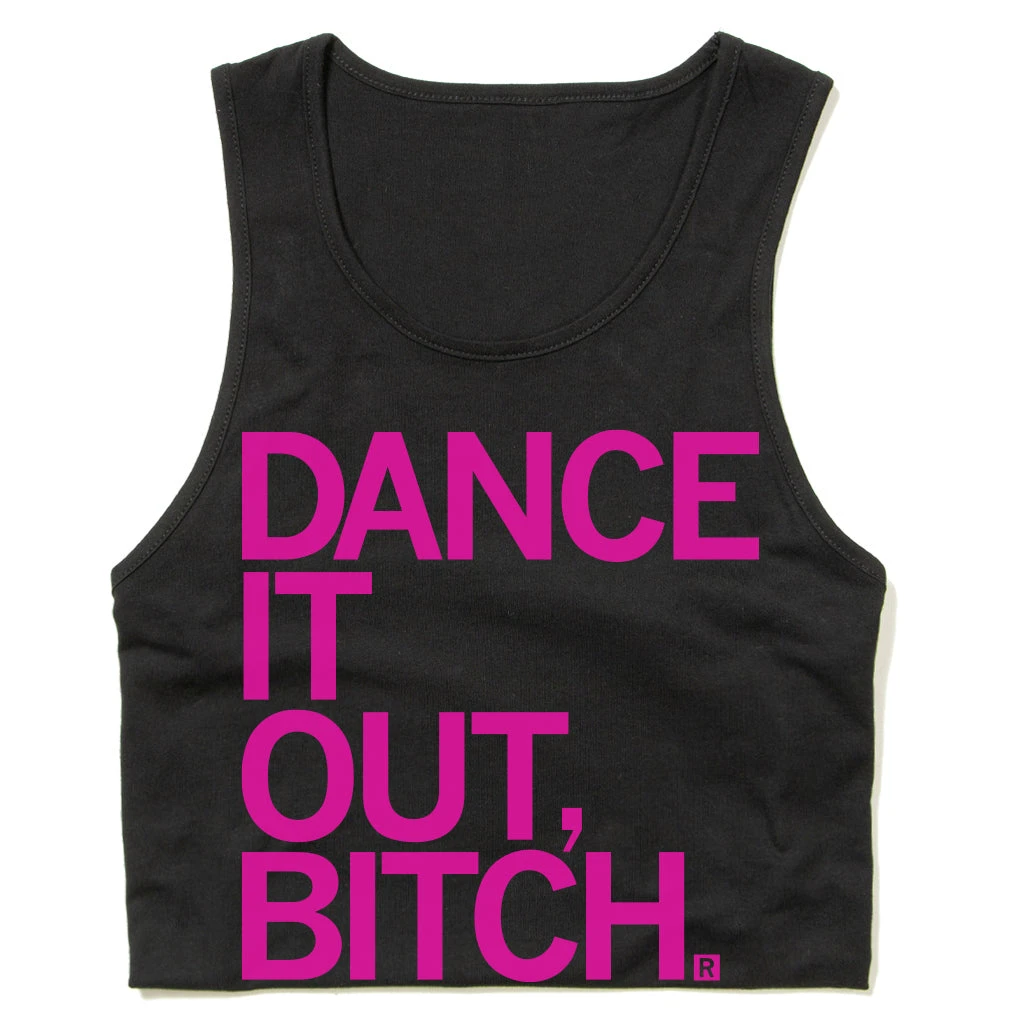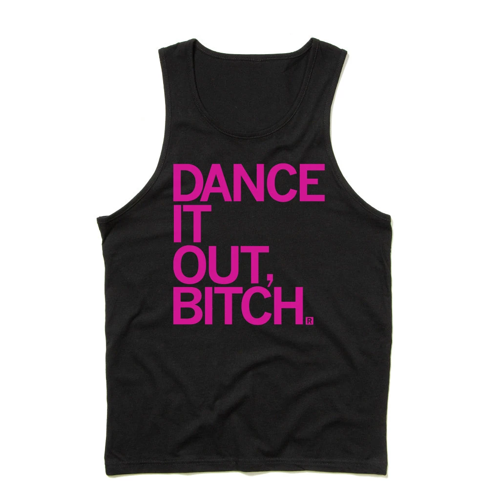 Dance It Out, Bitch. A Portion of All RAYGUN Sales Raise Money For Organizations That We Support. Rhodamine Red Screen Print on a Black Tank Top (100% Combed and Ringspun Cotton) Cut & sewn sweatshop-free. Designed & screen printed by union labor at RAYGUN.
