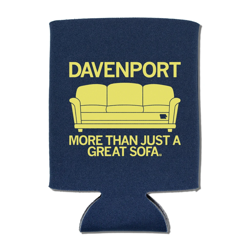 Davenport: More Than Just A Great Sofa. Primrose plastisol ink print on Navy fade-resistant polyester covered scuba foam can cooler. A Portion of All RAYGUN Sales Raise Money For Organizations That We Support. Designed and printed by Union Labor at RAYGUN. Imported and printed in the USA.