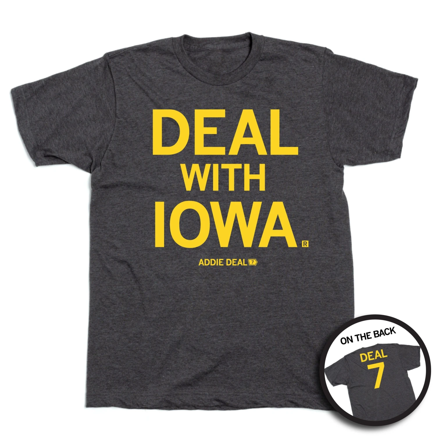 Deal with Iowa. Officially licensed with Addie Deal. This shirt has been approved by Addie Deal. A Portion of All RAYGUN Sales Raise Money For Organizations That We Support. Cold Screen Print on Front and Back on a Charcoal T-shirt (50% Combed Ringspun Cotton / 50% Polyester). Cut and sewn sweatshop free. Designed and printed by Union Labor at RAYGUN.