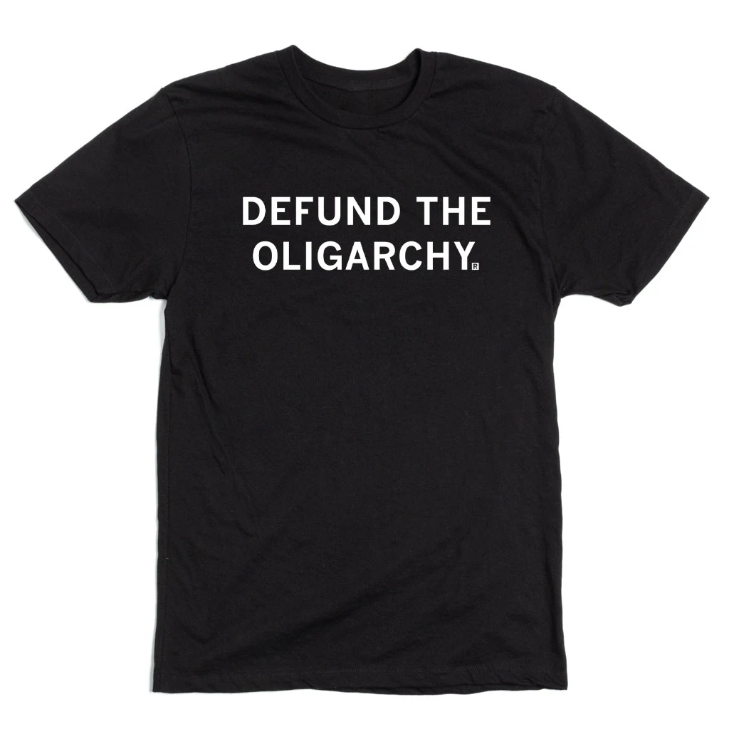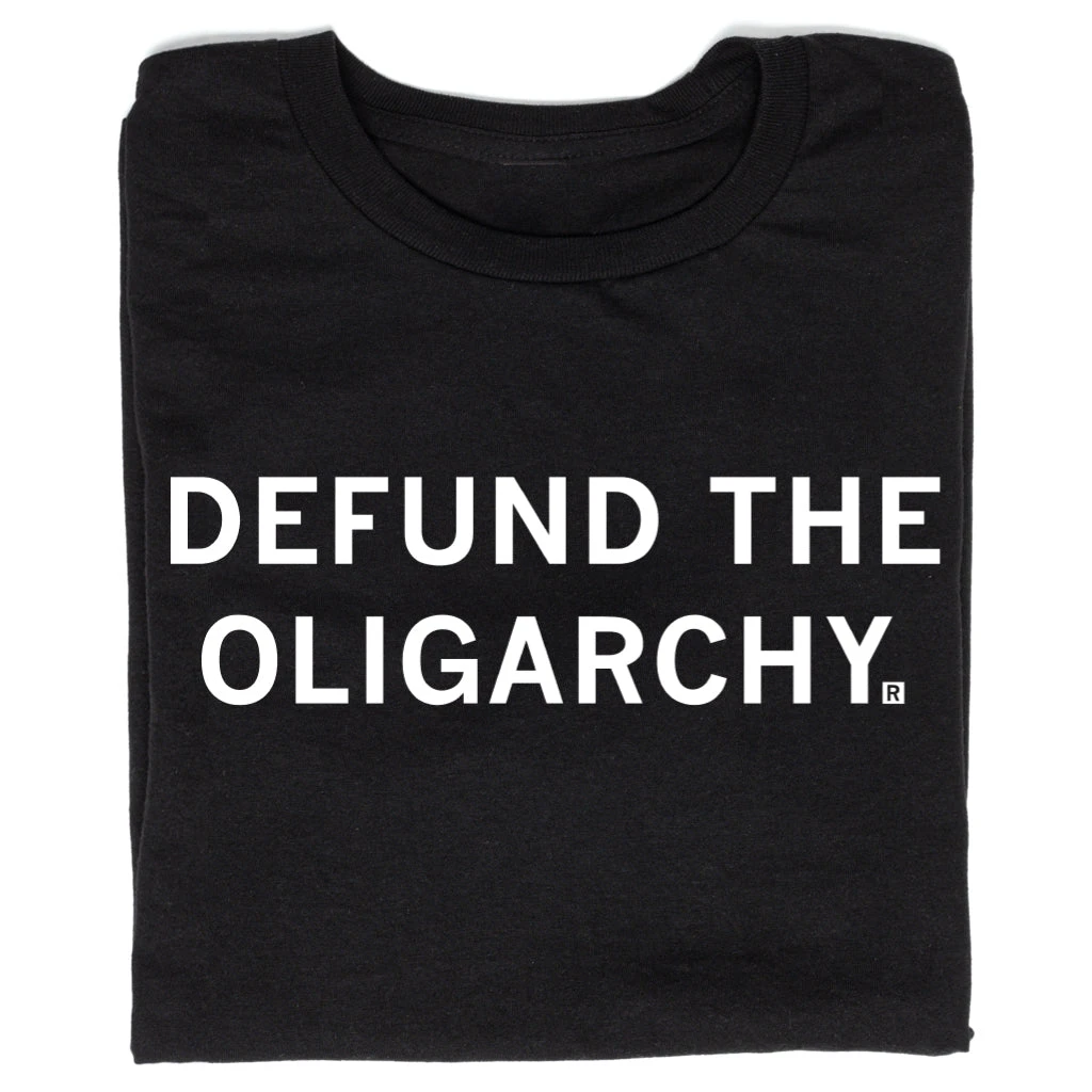 Defund the Oligarchy. No one voted for Musk. A Portion of All RAYGUN Sales Raise Money For Organizations That We Support. White Screen Print on a Black T-shirt (100% Combed Ringspun Cotton). Cut & sewn sweatshop free. Designed and Printed by Union Labor at RAYGUN.