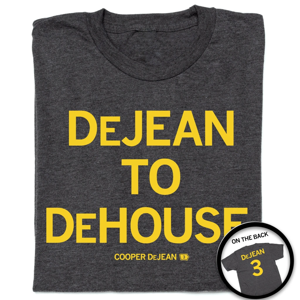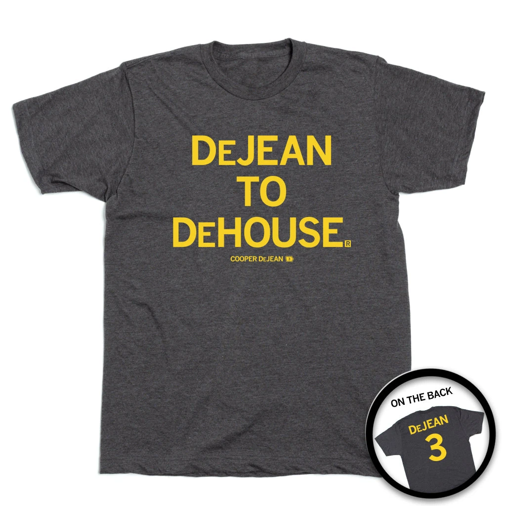 DeJean to DeHouse. Officially licensed with Cooper DeJean. This shirt has been approved by Cooper DeJean. Gold Screen Print on a Charcoal T-shirt (50% Combed Ringspun Cotton 50% Polyester). Cut and sewn sweatshop free. Designed and printed by Union Labor at RAYGUN.