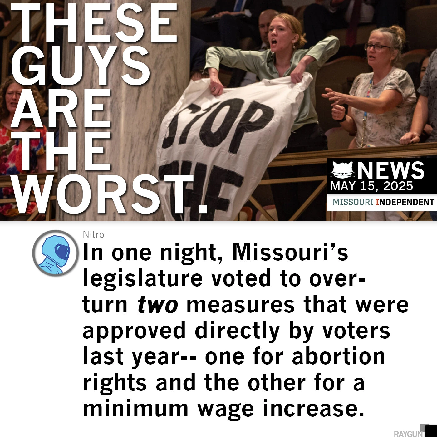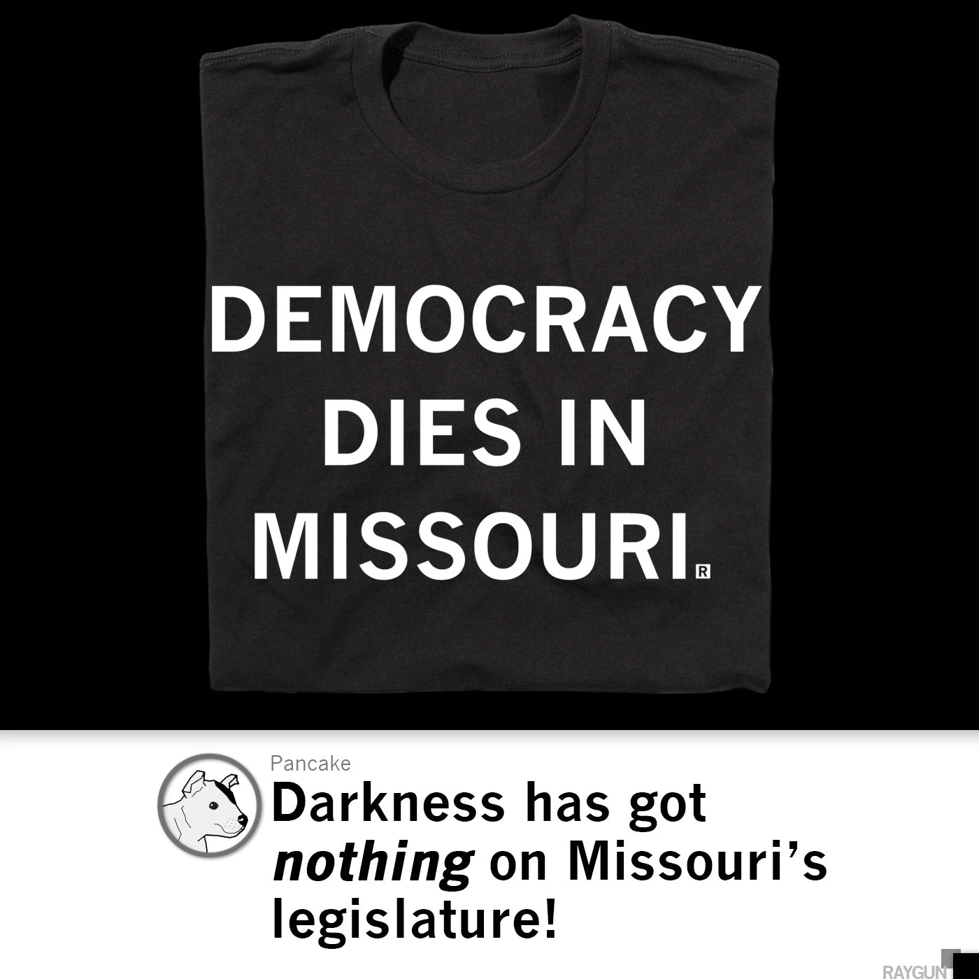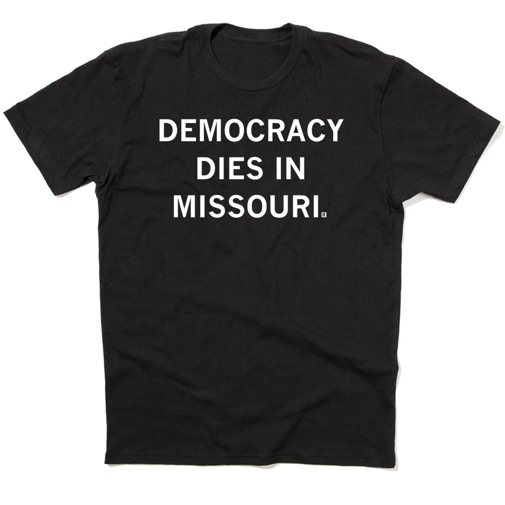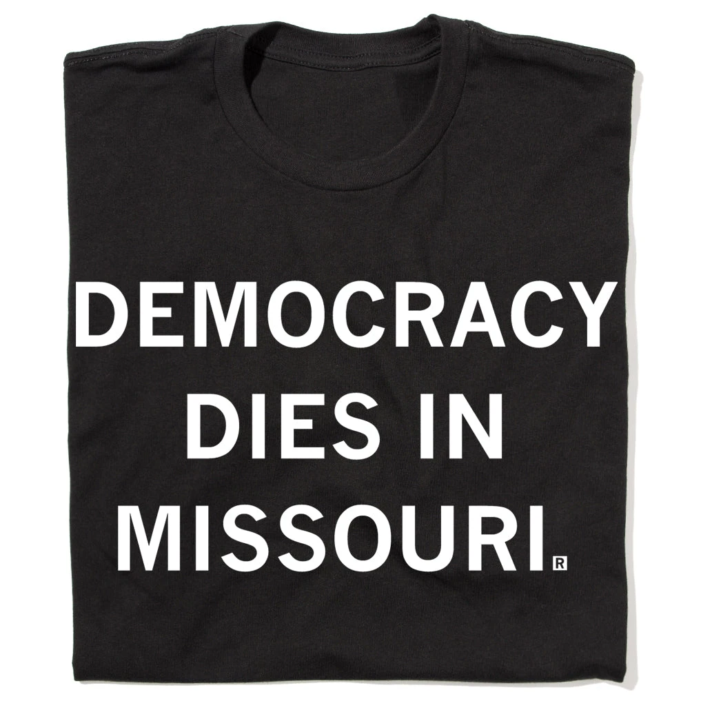 Democracy dies in Missouri. A Portion of All RAYGUN Sales Raise Money For Organizations That We Support. White Screen Print on a Black T-shirt (100% Combed Ringspun Cotton). Cut & sewn sweatshop free. Designed and Printed by Union Labor at RAYGUN.