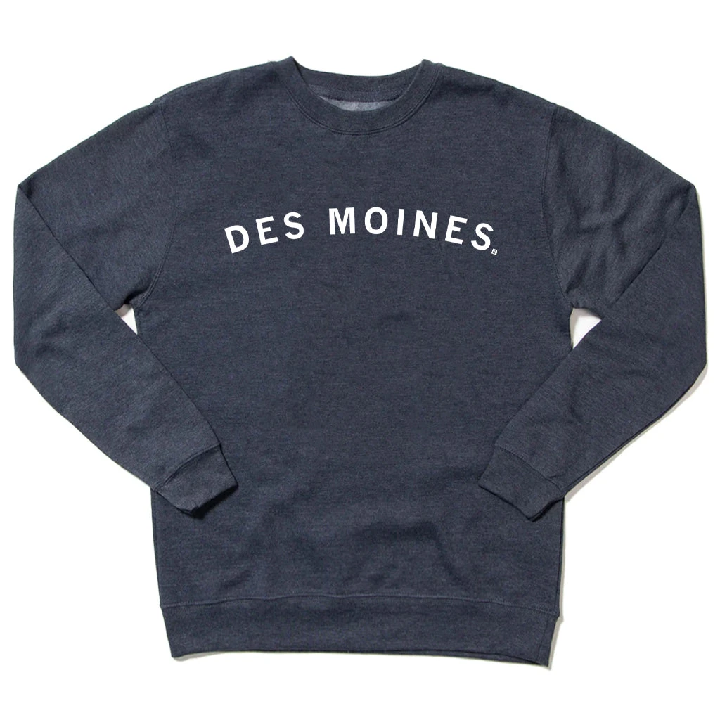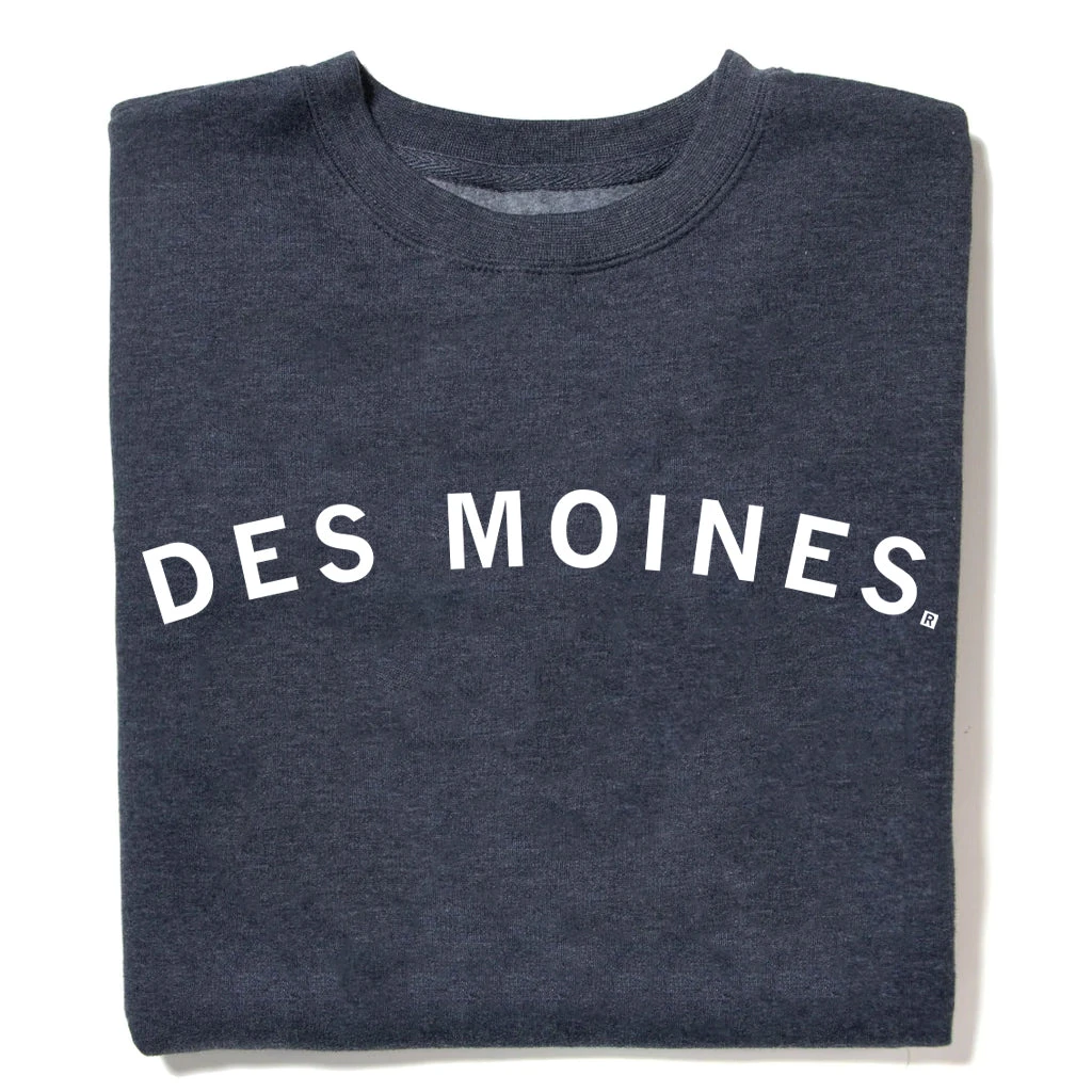 Des Moines, Iowa. A Portion of All RAYGUN Sales Raise Money For Organizations That We Support. White Screen Print on a Heather Navy Crew Sweatshirt (80% Combed Ringspun Cotton / 20% Polyester). Cut and sewn sweatshop free. Designed and printed by Union Labor at RAYGUN.