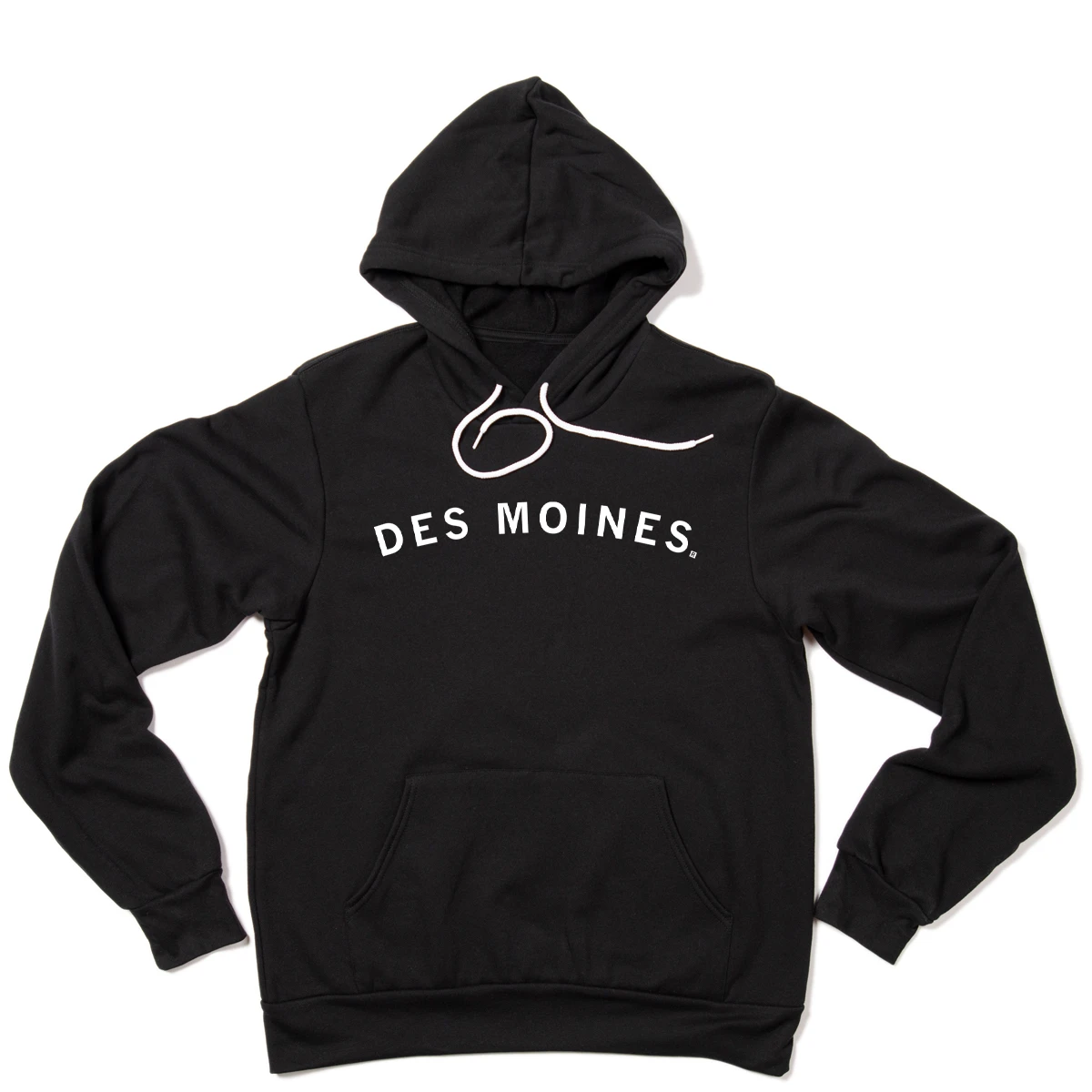 Des Moines. A Portion of All RAYGUN Sales Raise Money For Organizations That We Support. White Screen Print on a Black Pullover Hoodie (52% Combed Ringspun Cotton / 48% Polyester). Cut and sewn sweatshop free. Designed and printed by Union Labor at RAYGUN.