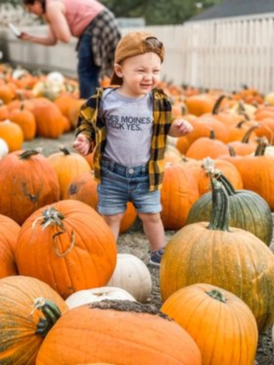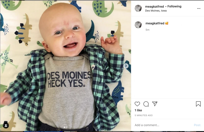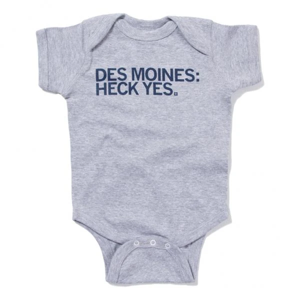 Des Moines: Heck Yes! Navy Screen Print on a Heather Grey Onesie (90% Baby Rib Cotton / 10% Polyester). Item will shrink an average of one size when put in the dryer. Cut and sewn sweatshop free. Designed and printed by Union Labor at RAYGUN.