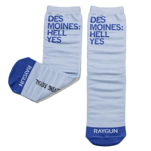 Des Moines: Hell Yes! One size fits most. (100% polyester) Women’s shoe size 4-12, Men’s shoe size 6-13. Each sock is handmade and – due to the human condition – imperfections may occur. Manufactured by Living Royal in Chicago, IL and designed by RAYGUN.