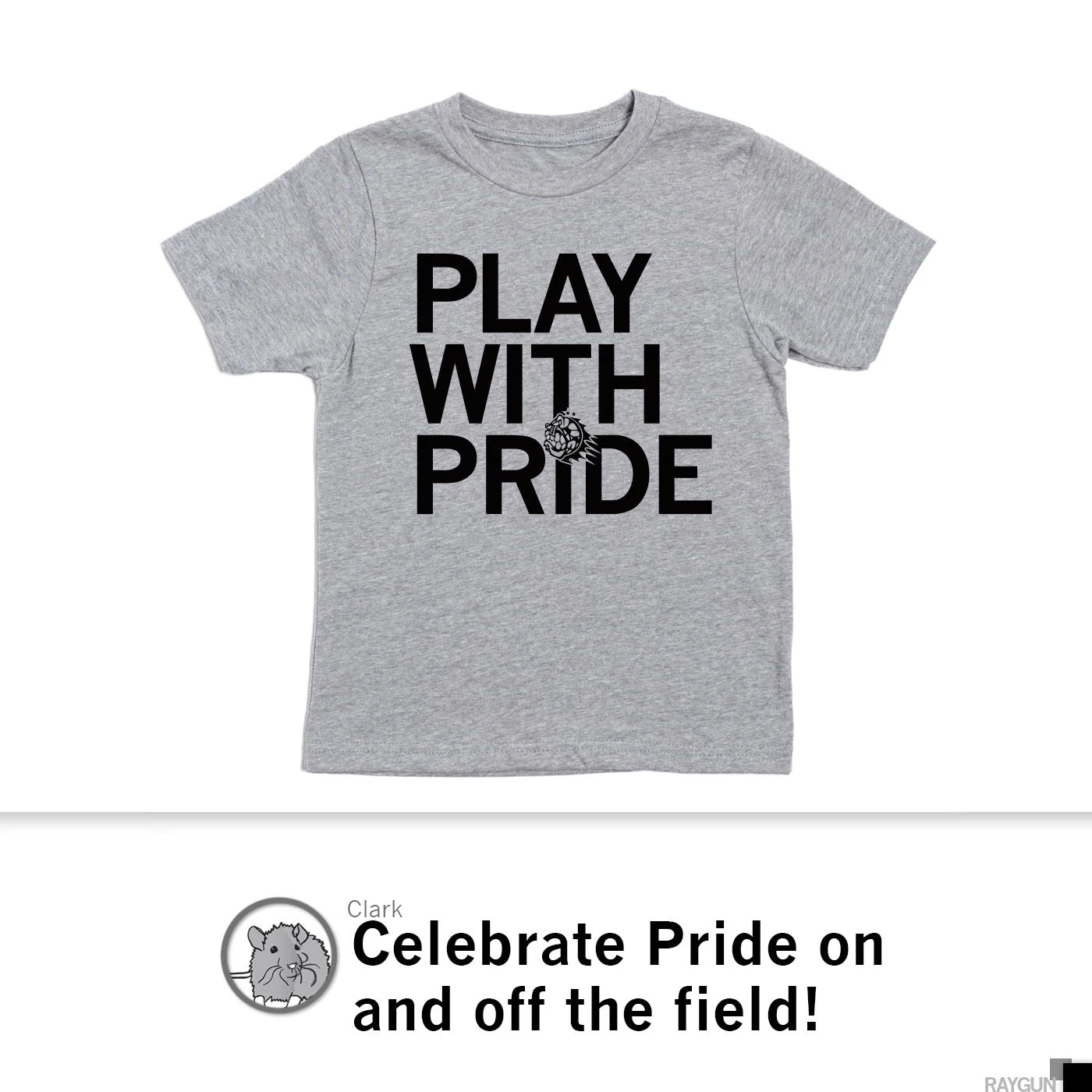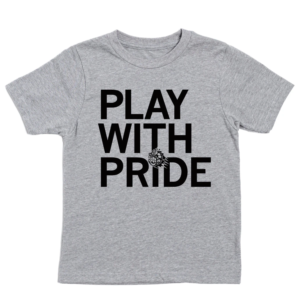 Play with Pride Kids. Official Des Moines Menace Merch! A Portion of All RAYGUN Sales Raise Money For Organizations That We Support. Black Screen Print on a Heather Grey Shirt (90% Cotton / 10% Polyester). Cut and sewn sweatshop free. Designed and printed by Union Labor at RAYGUN.