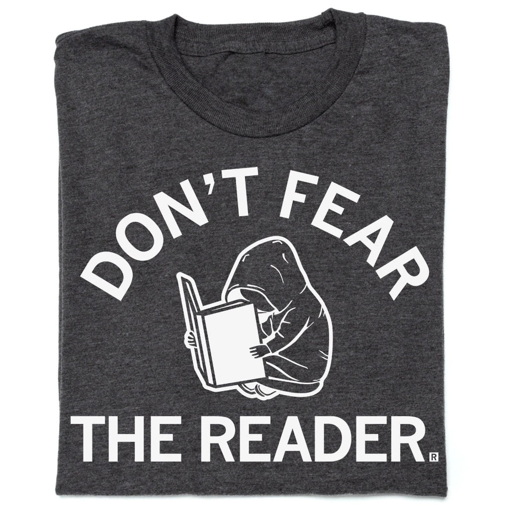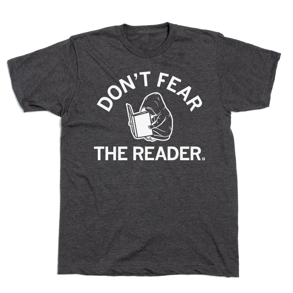 Don’t Fear the Reader. Some proceeds from this shirt benefit the local ACLU Chapters, public schools, and public libraries. White Screen Print on a Charcoal T-shirt (50% Polyester / 50% Combed Ringspun Cotton). Cut and sewn sweatshop free. Designed and printed by Union Labor at RAYGUN.