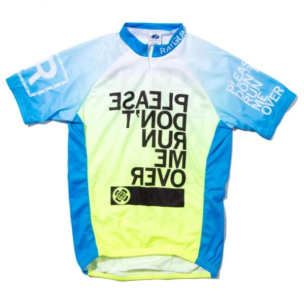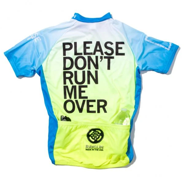 Please Don’t Run Me Over! Bike jerseys fit snuggly—refer to sizing guide for best fit. Multicolor print on front and back. Sleeves Club Raglan’s style Bike Jersey (100% Polyester). There is 3/4 length hidden zipper on the front and back there are three pockets for storage on the back. Designed by RAYGUN and made by voler pemium apparel in Grover Beach, California.