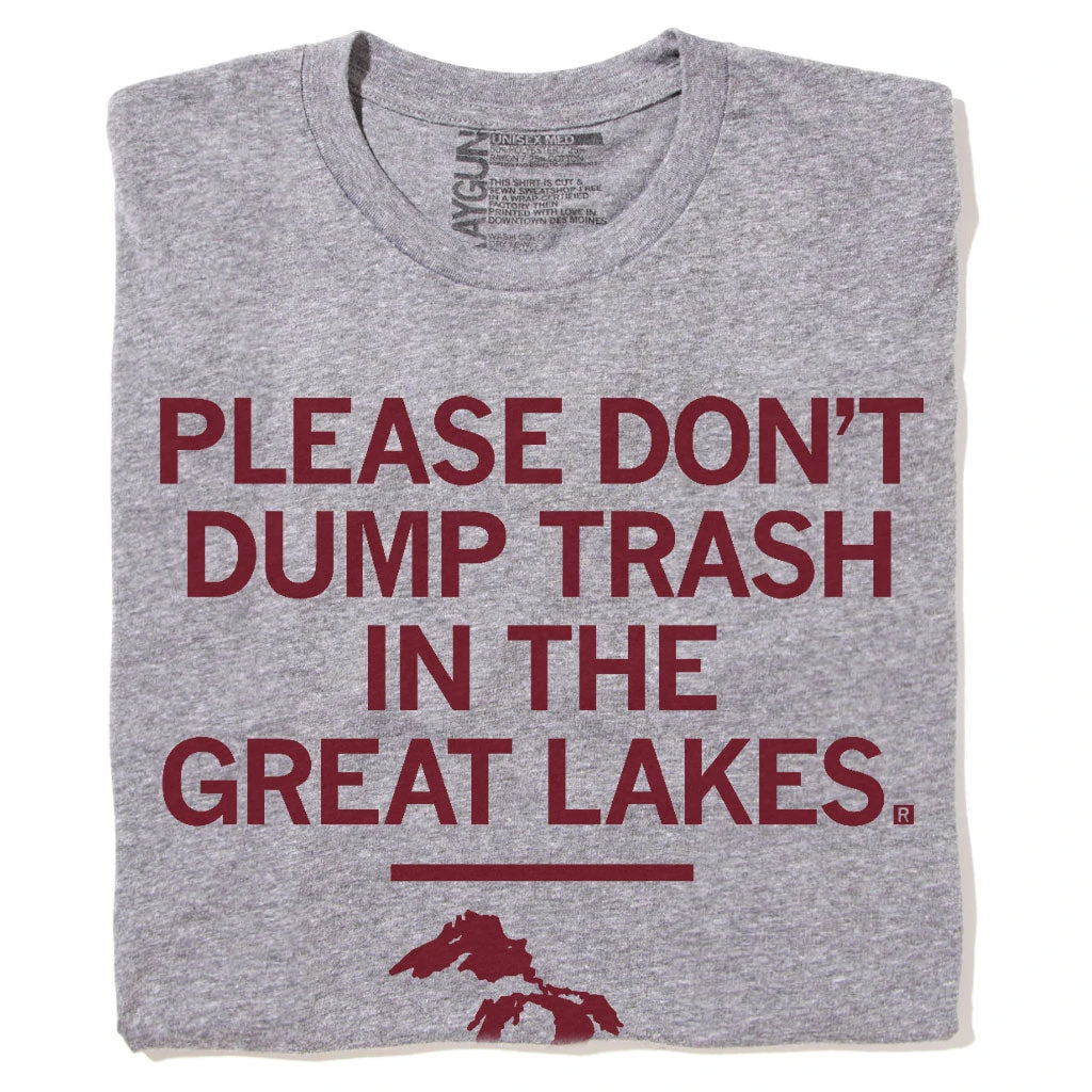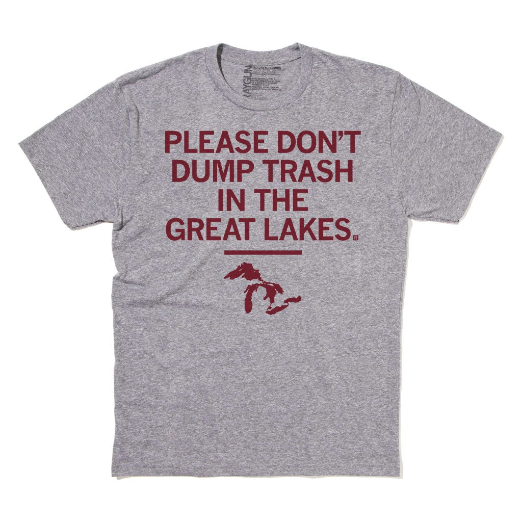 Please Don’t Dump Trash In The Great Lakes! Some Proceeds Benefit the Alliance for the Great Lakes. RAYGUN is also a donor to the Environmental Law Policy Center, which advocates for the Great Lakes. This Design Has Been Retired and is No Longer Available on Our Sales Floors But Can Be Ordered Here Online! Since All of Our Retired Designs Are Printed on Demand, Please Allow For a Couple Extra Days Before Shipping. Cardinal Screen Print on a Heather Grey T-shirt (65% Polyester / 35% Combed Ringspun Cotton). Cut and sewn sweatshop free. Designed and printed by Union Labor at RAYGUN.