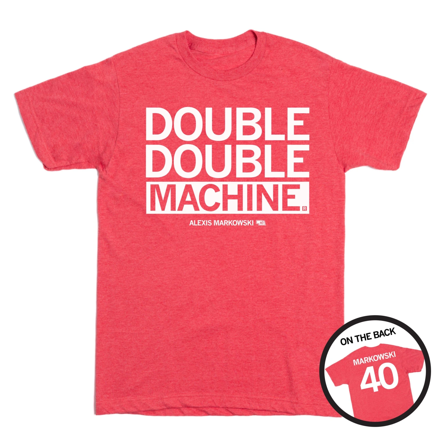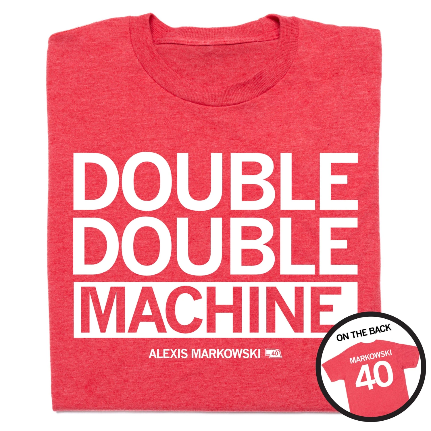 Alexis Markowski: the Double Double Machine. Approved by Alexis Markowski. A Portion of All RAYGUN Sales Raise Money For Organizations That We Support. White Screen Print on a Heather Red T-shirt on Front and Back (50% Combed Ringspun Cotton / 50% Polyester). Cut and sewn sweatshop free. Designed and printed by Union Labor at RAYGUN.