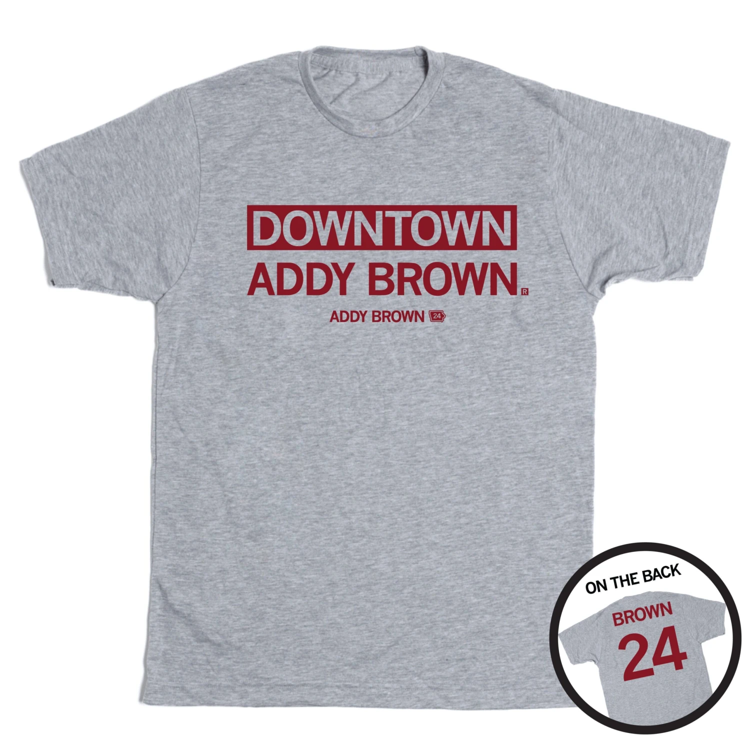 Downtown Addy Brown. Officially licensed with Addy Brown. This shirt has been approved by Addy Brown. A Portion of All RAYGUN Sales Raise Money For Organizations That We Support. Cardinal Screen Print on a Heather Grey T-shirt (65% Polyester / 35% Combed Ringspun Cotton). Cut & sewn sweatshop free. Designed and Printed by Union Labor at RAYGUN.