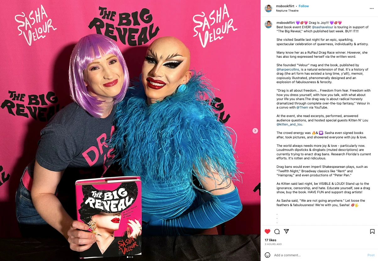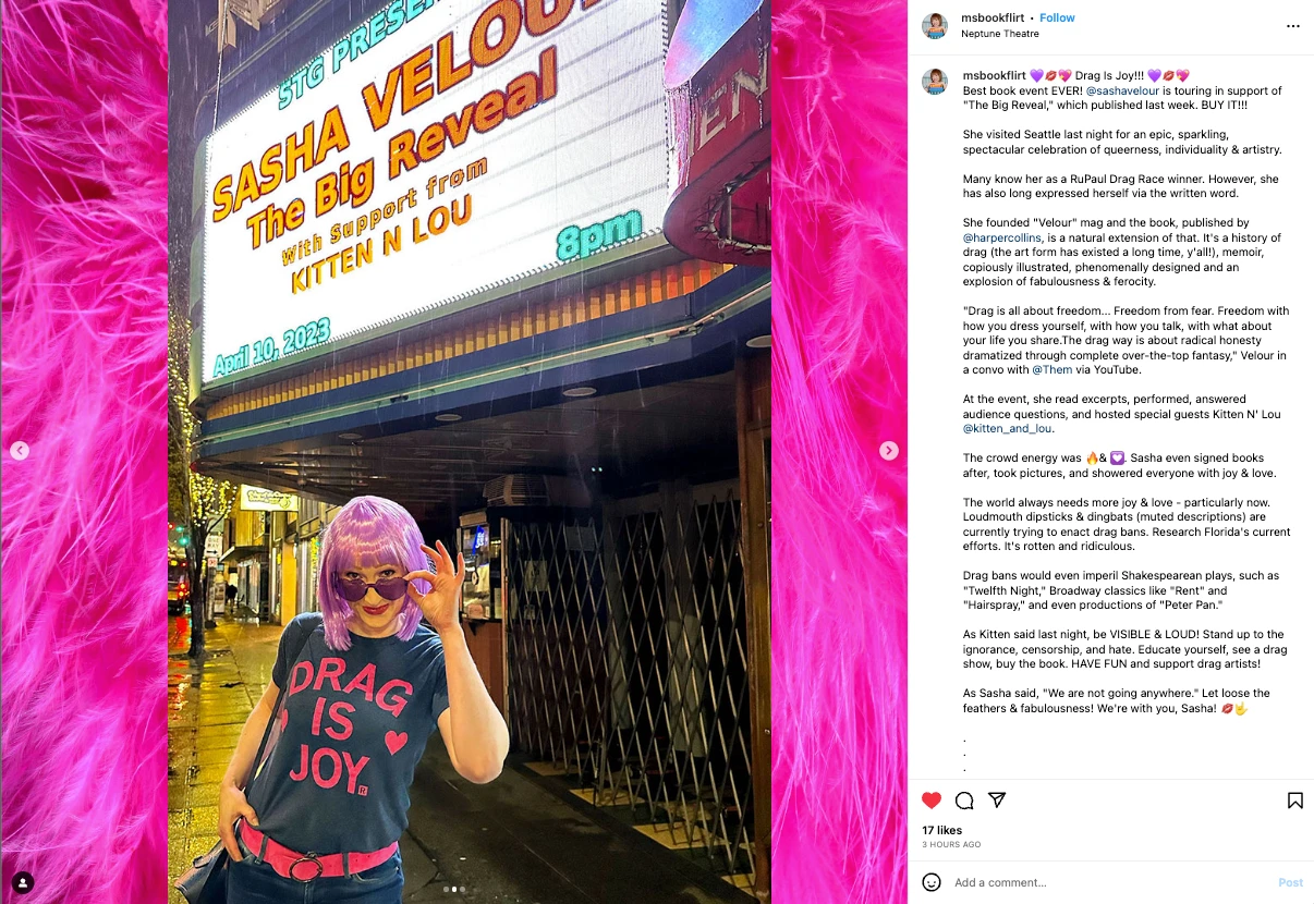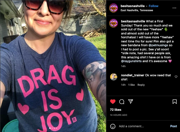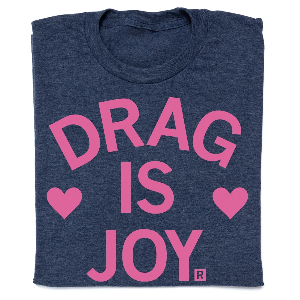 Drag is Joy. A Portion of All RAYGUN Sales Raise Money For Organizations That We Support. Neon Pink Screen Print on a Heather Denim T-shirt (50% Combed Ringspun Cotton / 50% Polyester). Cut and sewn sweatshop free. Designed and printed by Union Labor at RAYGUN.