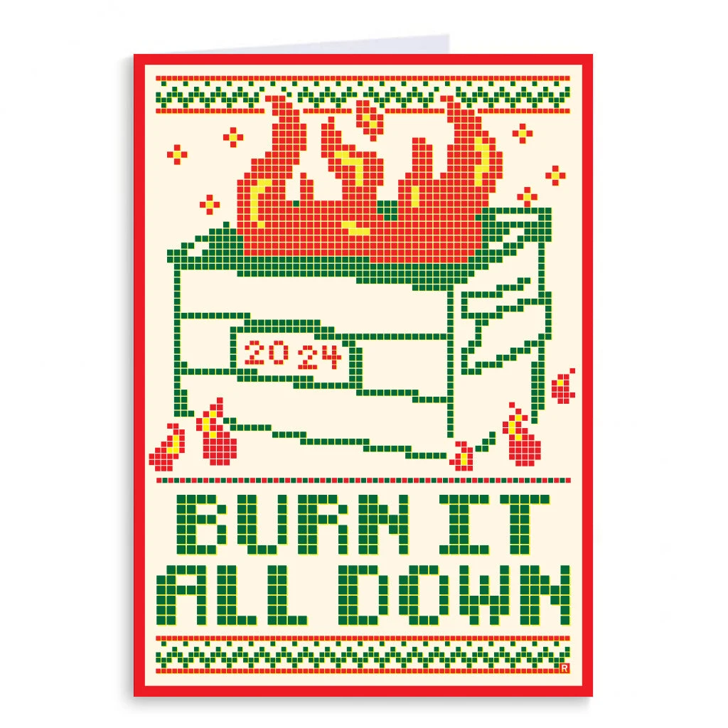 2024: Burn It All Down. A Portion of All RAYGUN Sales Raise Money For Organizations That We Support. 5″ x 7″ Folded Greeting Card. Inside of the card is blank and envelope included. Designed by RAYGUN and printed by union labor at Garner Printing in Des Moines, IA.