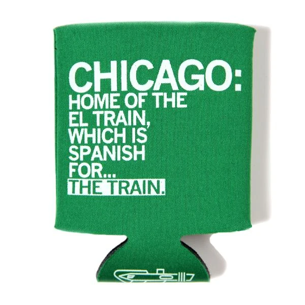 Chicago: Home Of The El Train, Which Is Spanish For … The Train. White plastisol ink print on green fade-resistant polyester covered scuba foam. Designed by RAYGUN. Imported and printed in the USA.