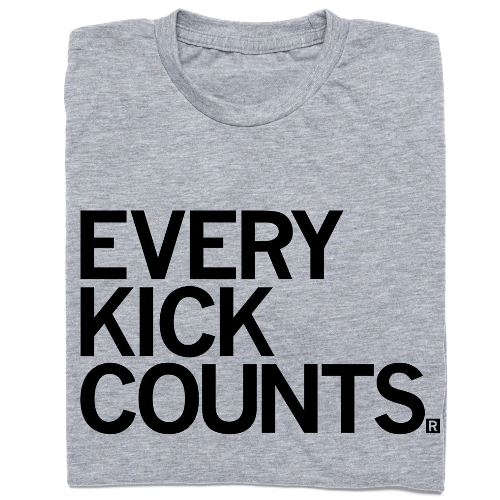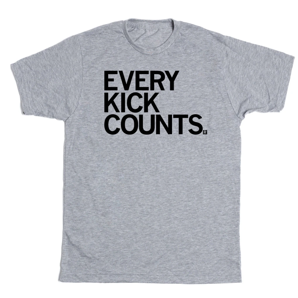 Every Kick Counts. Proceeds benefit Count the Kicks. Black Screen Print on a Heather Grey T-shirt (65% Polyester / 35% Combed Ringspun Cotton). Cut and sewn sweatshop free. Designed and printed by Union Labor at RAYGUN.
