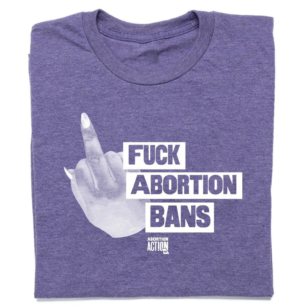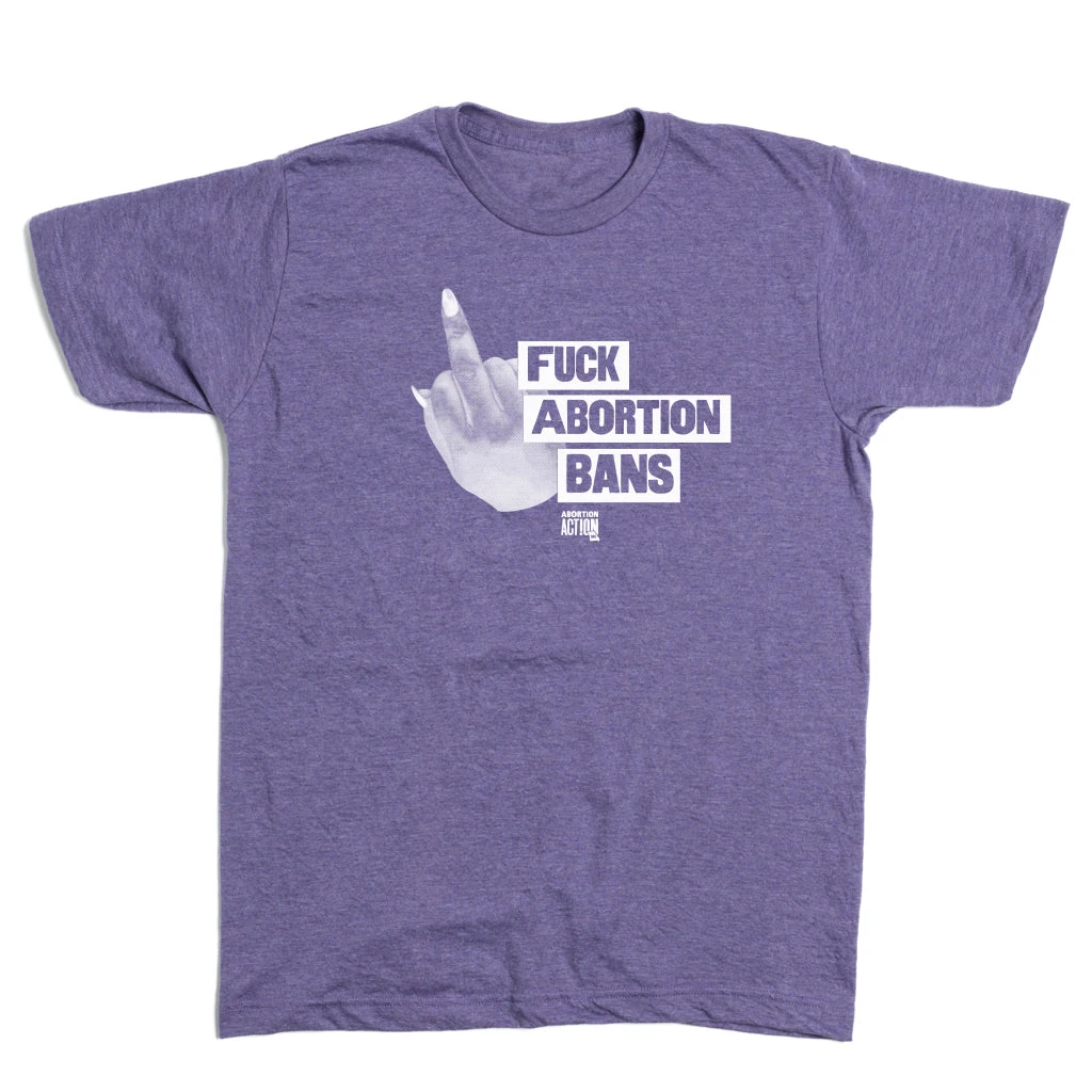 Fuck Abortion Bans. For more information on how to get involved visit Abortion Action Missouri and Missourians for Constitutional Freedom. White Screen Print on a Heather Purple T-shirt (50% Combed Ringspun Cotton / 50% Polyester). Cut & sewn sweatshop free. Designed and Printed by Union Labor at RAYGUN.