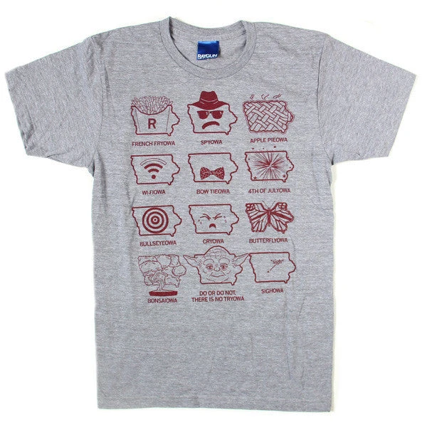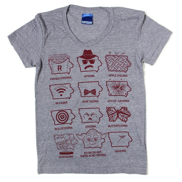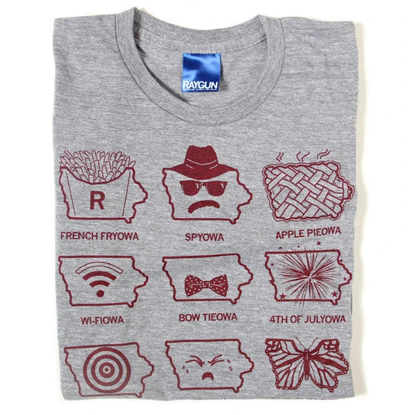 The Many Faces of Iowa. A Portion of All RAYGUN Sales Raise Money For Organizations That We Support. Maroon Screen Print on a Heather Grey T-shirt (50% Combed Ringspun Cotton / 50% Polyester). Cut and sewn sweatshop free. Designed and printed by Union Labor at RAYGUN.