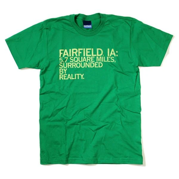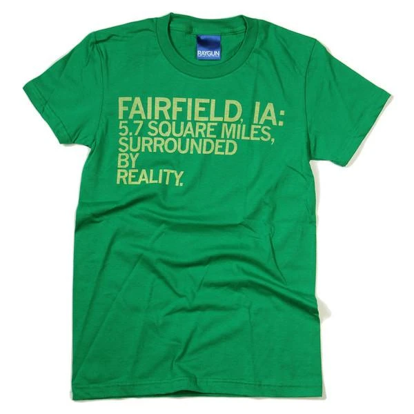 Fairfield, Iowa: 5.7 Square Miles, Surrounded By Reality. This Design Has Been Retired and is No Longer Available on Our Sales Floors But Can Be Ordered Here Online! Since All of Our Retired Designs Are Printed on Demand, Please Allow For a Couple Extra Days Before Shipping. A Portion of All Raygun Sales Raise Money For Organizations That We Support. Light Yellow Screen Print on a Heather Kelly Green T-Shirt. (50% Combed Ringspun Cotton / 50% Polyester). Cut and sewn sweatshop free. Designed and printed by Union Labor at RAYGUN.
