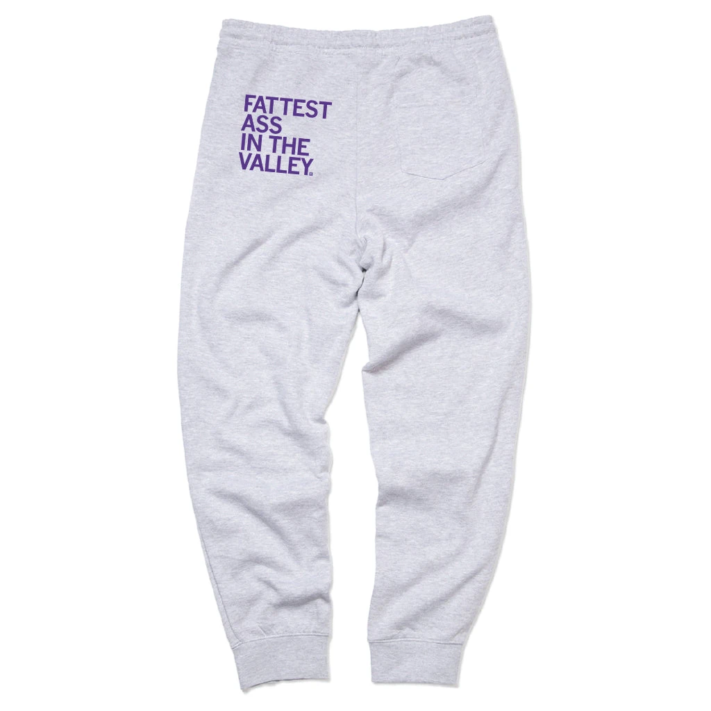 This is the fattest ass in the valley. You’re welcome. A Portion of All RAYGUN Sales Raise Money For Organizations That We Support. Purple Screen Print on Heather Grey Sweatpants (52% Combed Ringspun Cotton / 48% Polyester). Elastic Waistband with Shoestring Drawcord. Relaxed Fit. Back Pocket & Jersey Lined Hand Pockets. Cut and sewn sweatshop free. Designed and printed by Union Labor at RAYGUN.