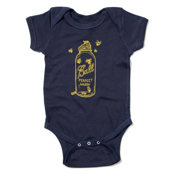 Firefly. Portion of All RAYGUN Sales Raise Money For Organizations That We Support. Gold Screen Print on a Navy Onesie. (100% Baby Rib Cotton). Item will shrink an average of one size when put in the dryer. Cut and sewn sweatshop free. Designed and printed by Union Labor at RAYGUN.