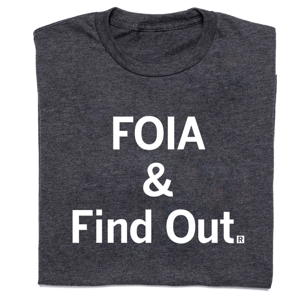 FOIA and find out. Made with permission from the original creators! Benefiting our friends at the NFOIC (National Freedom of Information Coalition). White Screen Print on a Charcoal T-shirt (50% Combed Ringspun Cotton / 50% Polyester). Cut & sewn sweatshop free. Designed and Printed by Union Labor at RAYGUN.