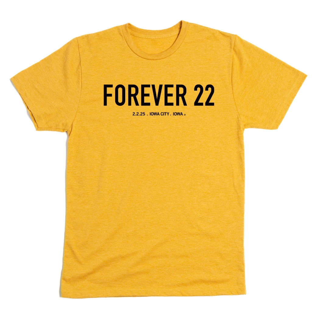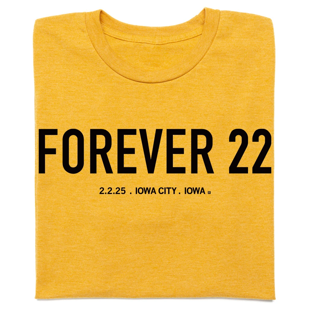 Forever 22. 2.2.25. Iowa City, Iowa. A Portion of All RAYGUN Sales Raise Money For Organizations That We Support. Black Screen Print on a Heather Mellow Yellow T-shirt (50% Combed Ringspun Cotton / 50% Polyester). Cut & sewn sweatshop free. Designed and Printed by Union Labor at RAYGUN.