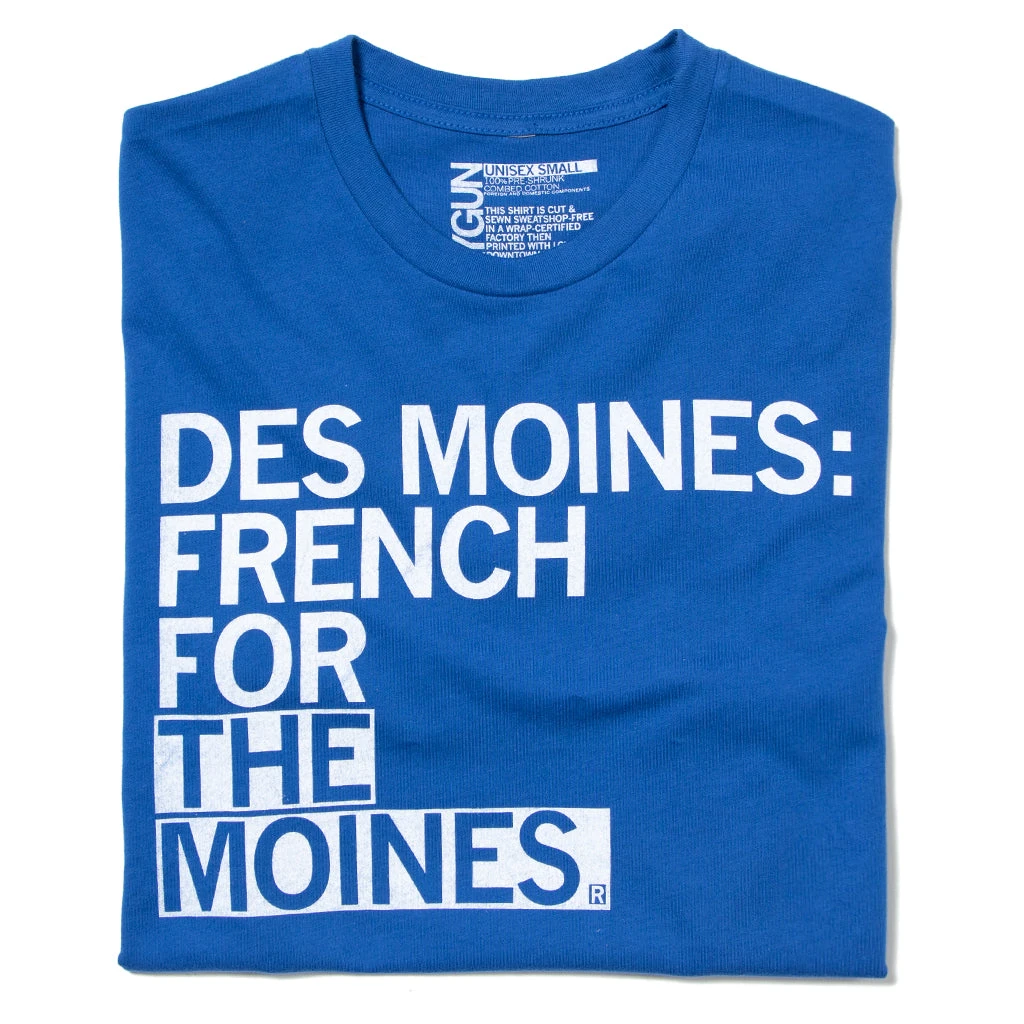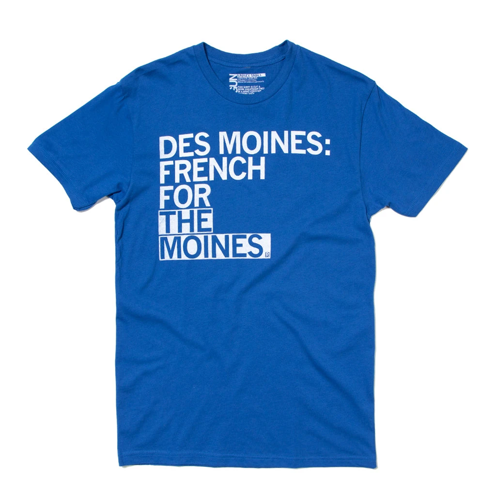 Des Moines: French For The Moines. A Portion of All RAYGUN Sales Raise Money For Organizations That We Support. White Screen Print on a Royal Blue T-shirt (100% Combed Ringspun Cotton). Cut and sewn sweatshop free. Designed and printed by Union Labor at RAYGUN.