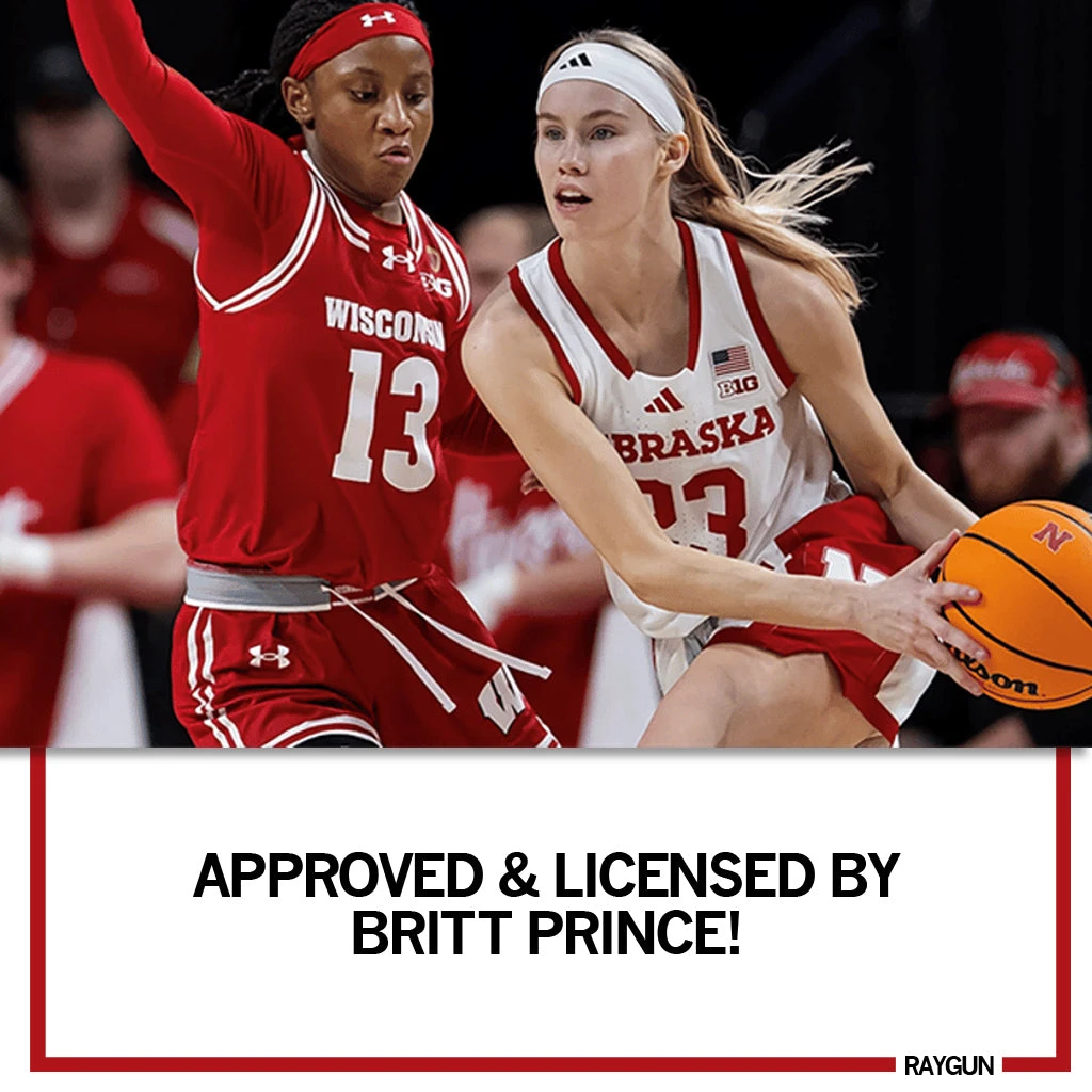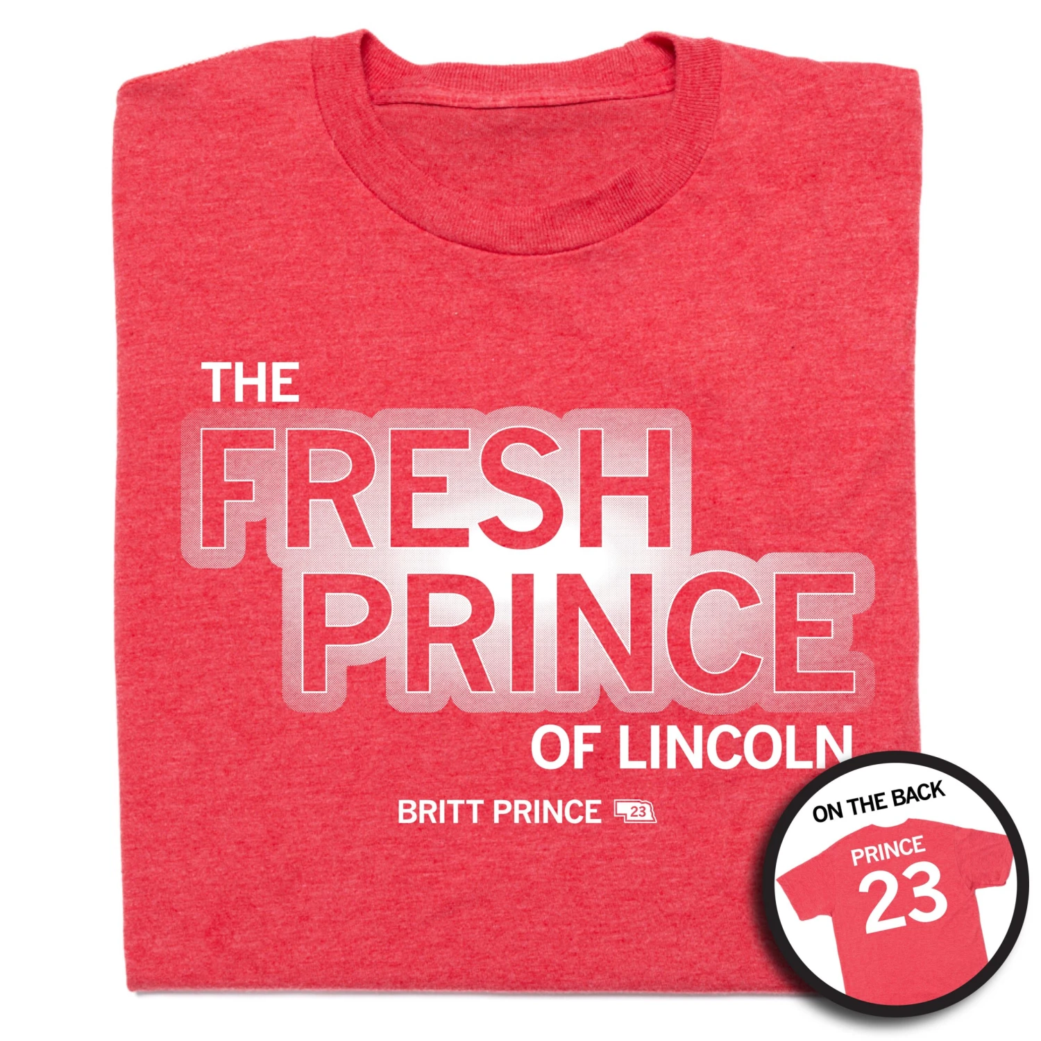 Britt Prince is the Fresh Prince of Lincoln. Officially licensed with Britt Prince. White Screen Print on a Heather Red T-shirt (50% Combed Ringspun Cotton / 50% Polyester). Cut & sewn sweatshop free. Designed and Printed by Union Labor at RAYGUN.