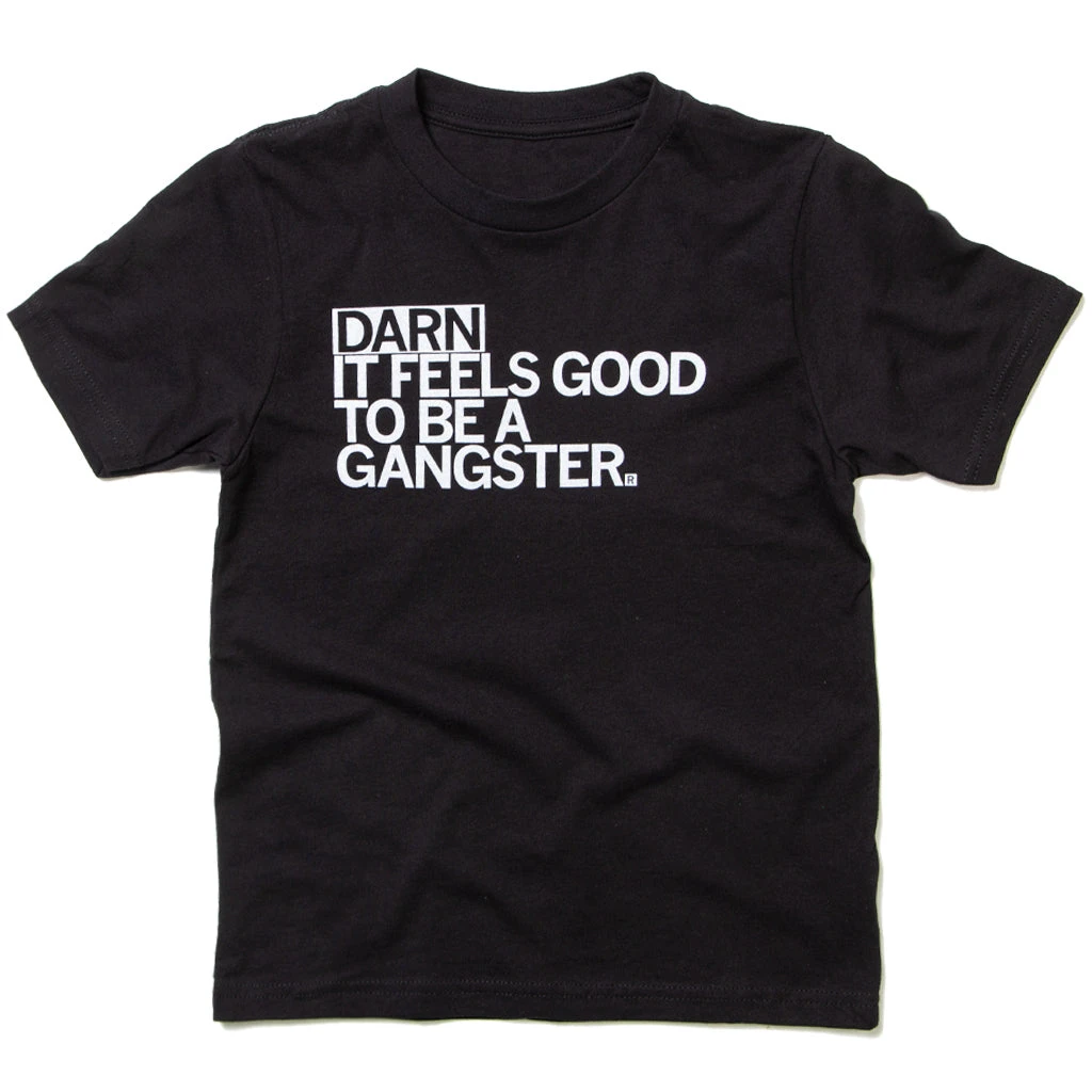 Darn it Feels Good to be a Gangster. White Screen Print on a Black T-shirt (100% Ringspun Cotton). Cut and sewn sweatshop free. Designed and printed by Union Labor at RAYGUN.