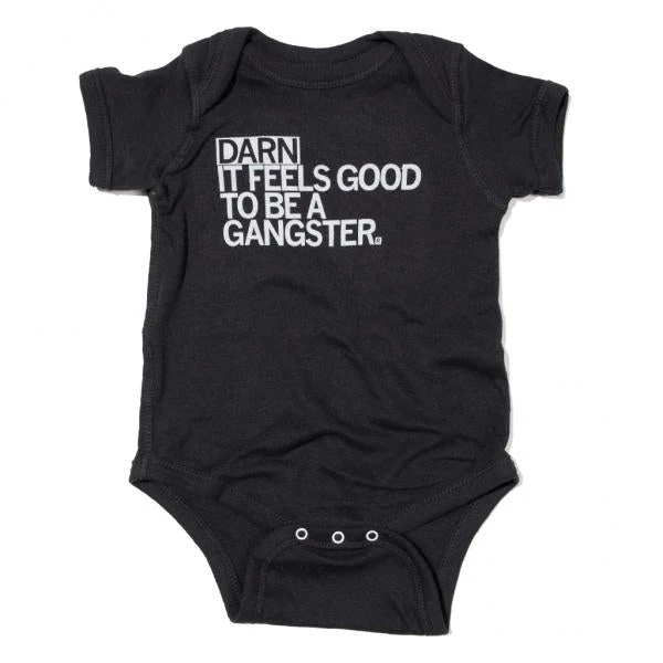 Darn It Feels Good To Be A Gangster. White screen print on black onesie (100% Ringspun Cotton). Item will shrink an average of one size when put in the dryer. Cut and sewn sweatshop free. Designed and printed by Union Labor at RAYGUN.