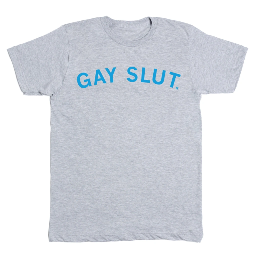 Gay Slut. A Portion of All RAYGUN Sales Raise Money For Organizations That We Support. Brite Blue Screen Print on a Light Grey T-shirt (90% Combed Ringspun Cotton / 10% Polyester). Cut & sewn sweatshop free. Designed and Printed by Union Labor at RAYGUN.