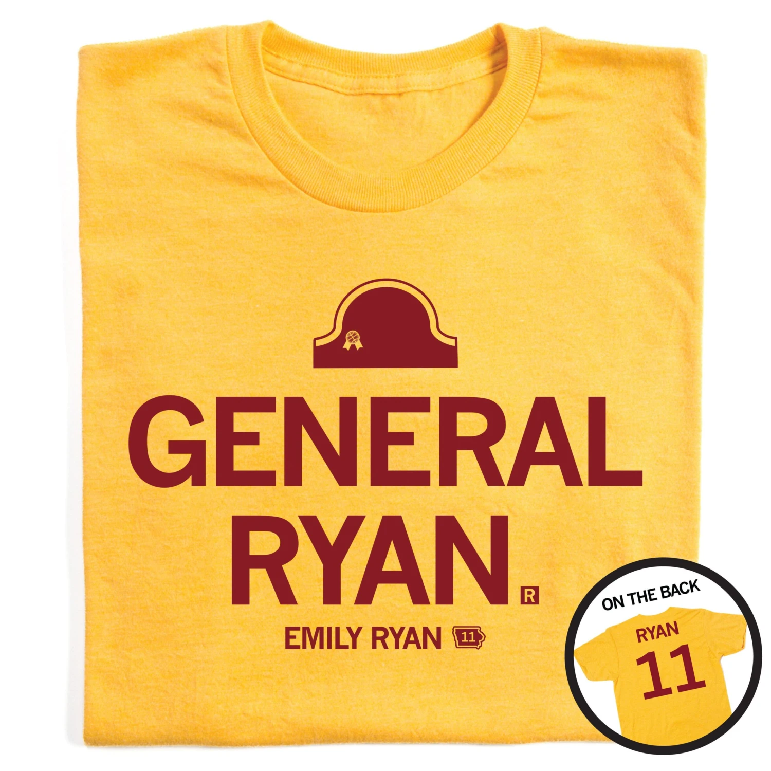 General Emily Ryan. Officially licensed with Emily Ryan. This shirt has been approved by Emily Ryan. Cardinal Screen Print on a Heather Mellow Yellow T-shirt (50% Combed Ringspun Cotton / 50% Polyester). Cut & sewn sweatshop free. Designed and Printed by Union Labor at RAYGUN.