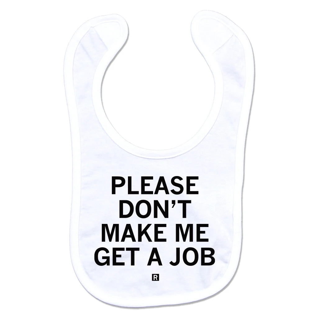 Please don’t make me get a job. A Portion of All RAYGUN Sales Raise Money For Organizations That We Support. Black Screen Print on a White Bib (100% Baby Rib Cotton). Cut and sewn sweatshop free. Designed and printed by Union Labor at RAYGUN.
