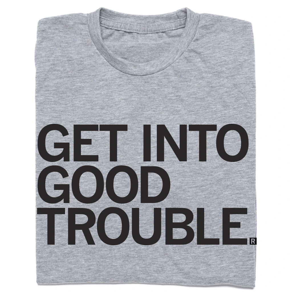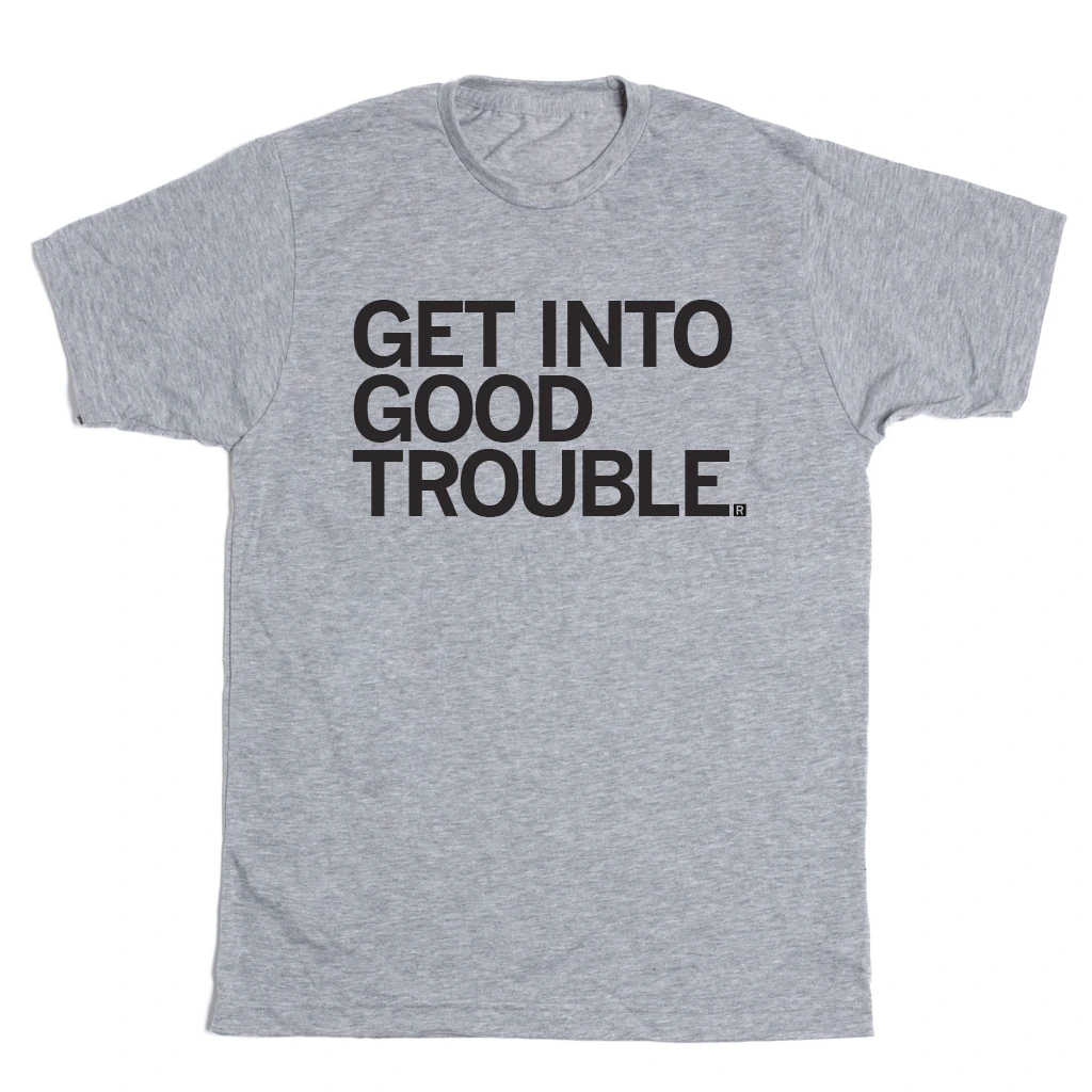 Get Into Good Trouble. This Design Has Been Retired and is No Longer Available on Our Sales Floors But Can Be Ordered Here Online! Since All of Our Retired Designs Are Printed on Demand, Please Allow For a Couple Extra Days Before Shipping. A Portion of All RAYGUN Sales Raise Money For Organizations That We Support. xxxxx Screen Print on a Heather Grey T-shirt (65% Polyester / 35% Combed Ringspun Cotton). Cut & sewn sweatshop free. Designed and Printed by Union Labor at RAYGUN.