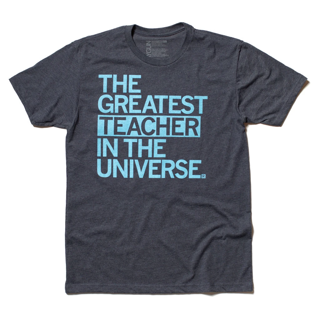 The Greatest Teacher In The Universe. A Portion of All RAYGUN Sales Raise Money For Organizations That We Support. Light Blue Screen Print on a Heather Denim T-shirt (50% Combed Ringspun Cotton / 50% Polyester). Cut and sewn sweatshop free in. Designed and printed by Union Labor at RAYGUN.