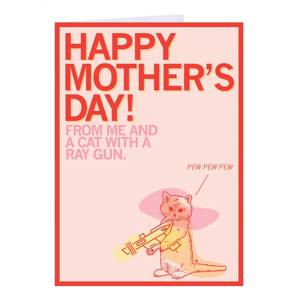 Happy Mother’s Day from me and a cat with a raygun. 5″ x 7″ Folded Greeting Card. Inside of the card is blank. Envelope included. Designed by RAYGUN and printed by Garner Printing in Des Moines, IA.