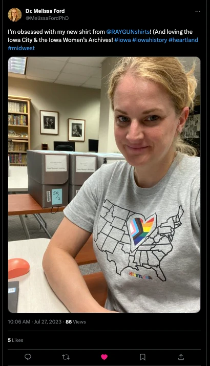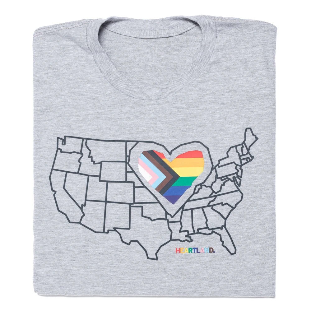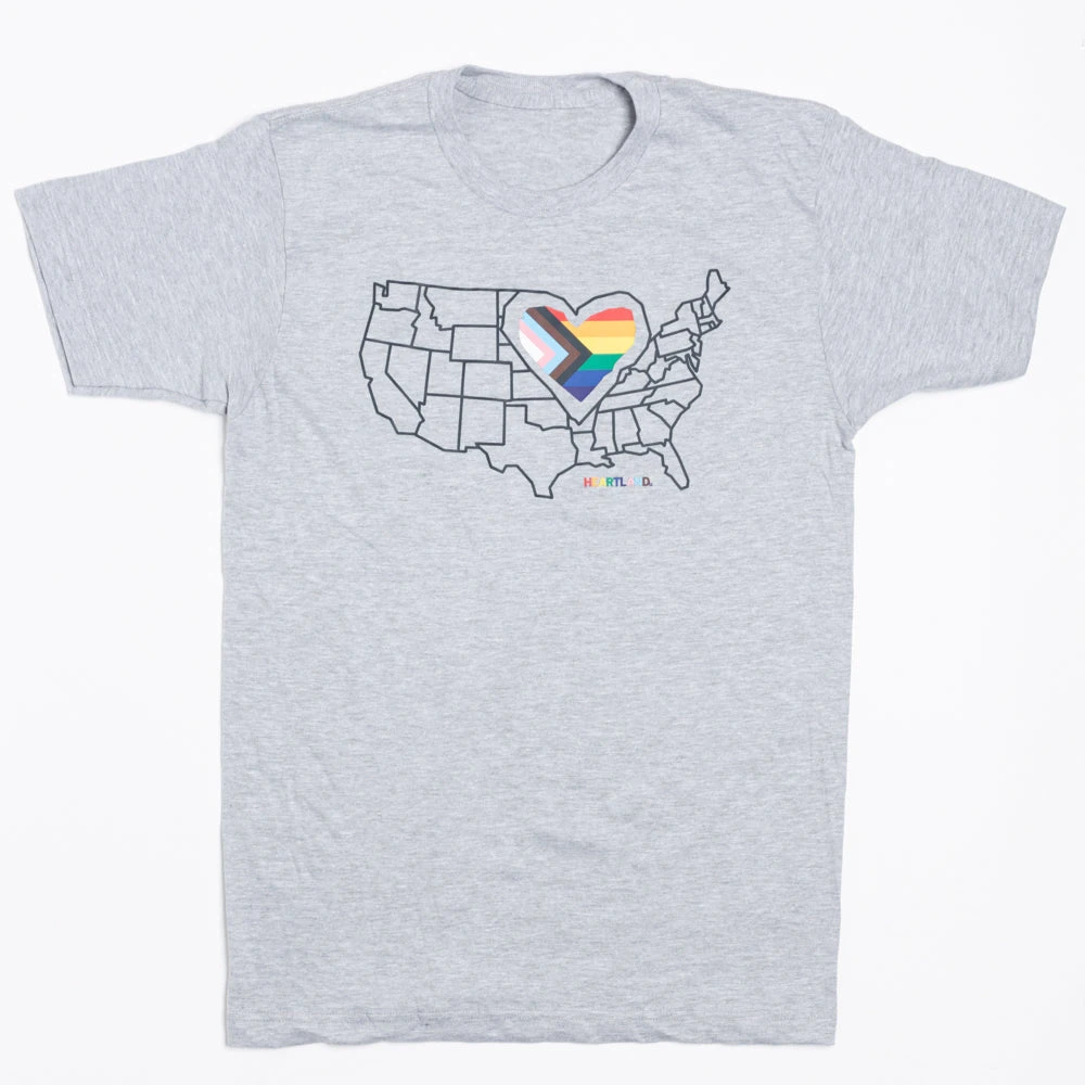 The Heartland has Pride. A Portion of All RAYGUN Sales Raise Money For Organizations That We Support. Heat Transfer on a Light Grey T-shirt (90% Combed Ringspun Cotton / 10% Polyester). Cut and sewn sweatshop free. Designed and printed by Union Labor at RAYGUN.