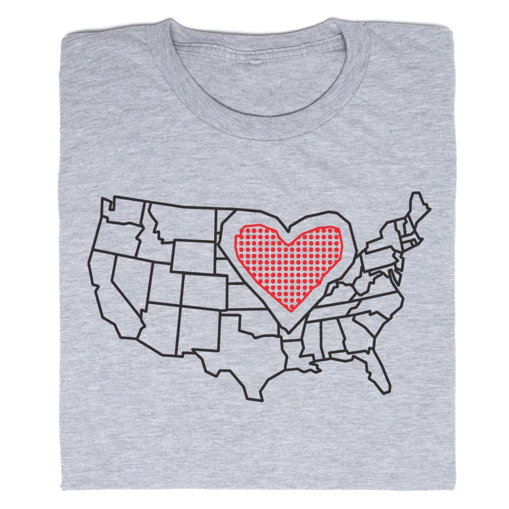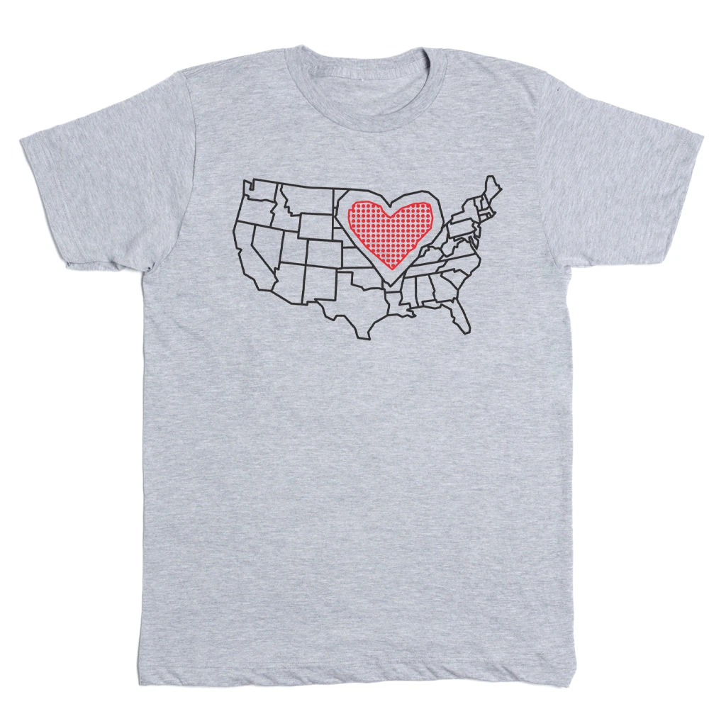 The Midwest: The Heartland! A Portion of All RAYGUN Sales Raise Money For Organizations That We Support. Black & Red Screen Print on a Light Grey T-shirt (90% Combed Ringspun Cotton / 10% Polyester). Cut and sewn sweatshop free. Designed and printed by Union Labor at RAYGUN.
