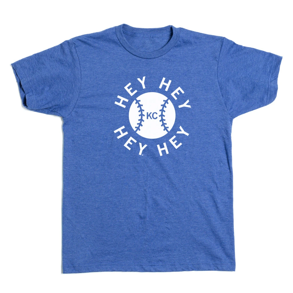Hey Hey Hey Hey. A Portion of All RAYGUN Sales Raise Money For Organizations That We Support. White Screen Print on a Heather Royal T-shirt (50% Combed Ringspun Cotton / 50% Polyester). Cut & sewn sweatshop free. Designed and Printed by Union Labor at RAYGUN.