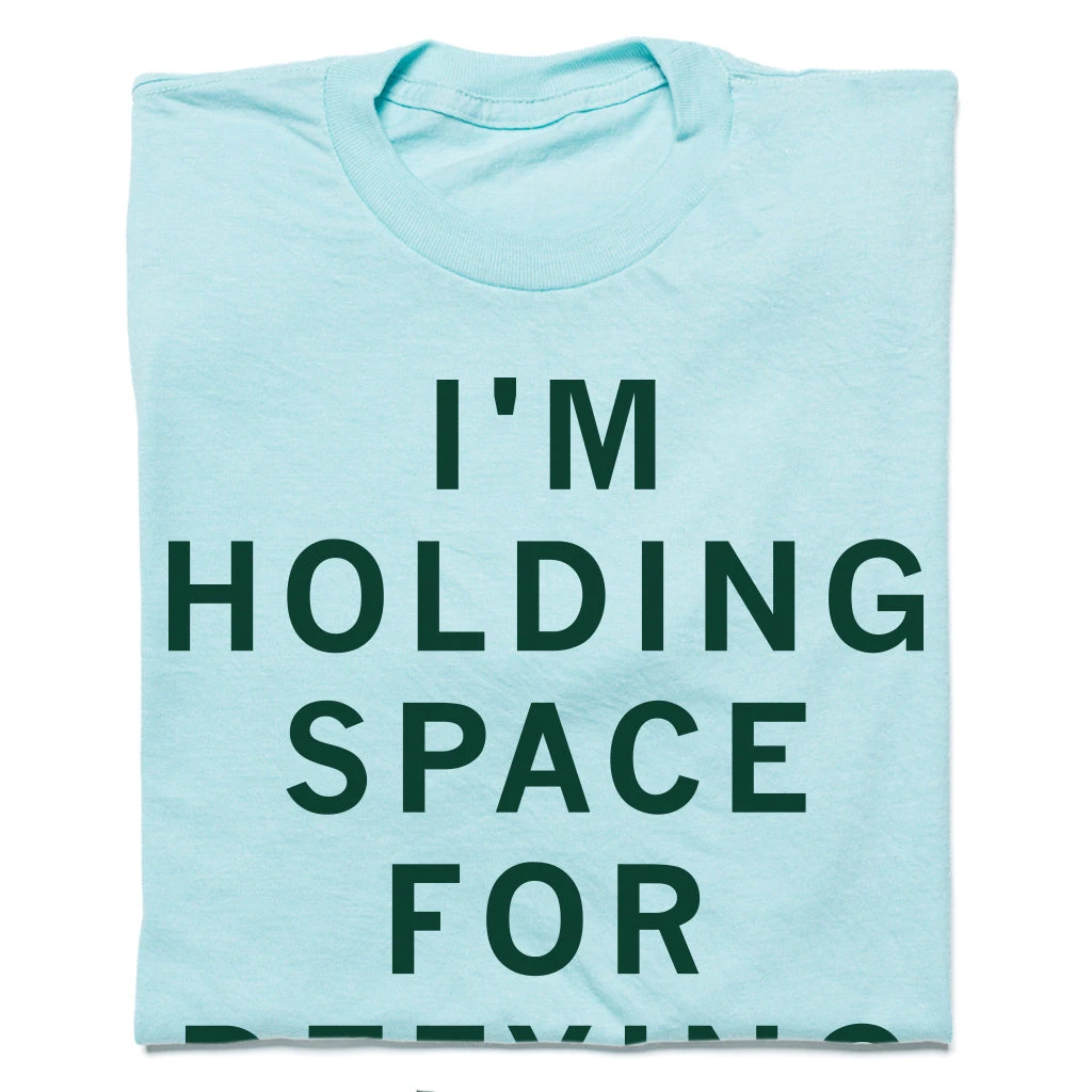 I’m holding space for defying gravity. A Portion of All RAYGUN Sales Raise Money For Organizations That We Support. Chrome Green Screen Print on a Heather Purist Blue T-shirt (50% Polyester / 50% Combed Ringspun Cotton). Cut & sewn sweatshop free. Designed and Printed by Union Labor at RAYGUN.
