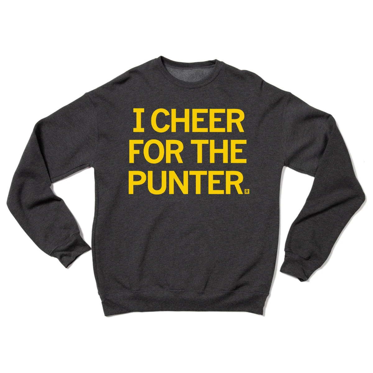 I Cheer For The Punter. A Portion of All RAYGUN Sales Raise Money For Organizations That We Support. Gold Screen Print on a Charcoal Heather Crew Sweatshirt (80% Combed Ringspun Cotton / 20% Polyester). Cut and sewn sweatshop free. Designed and printed by Union Labor at RAYGUN.