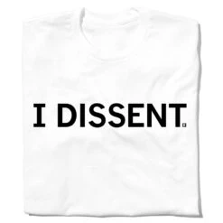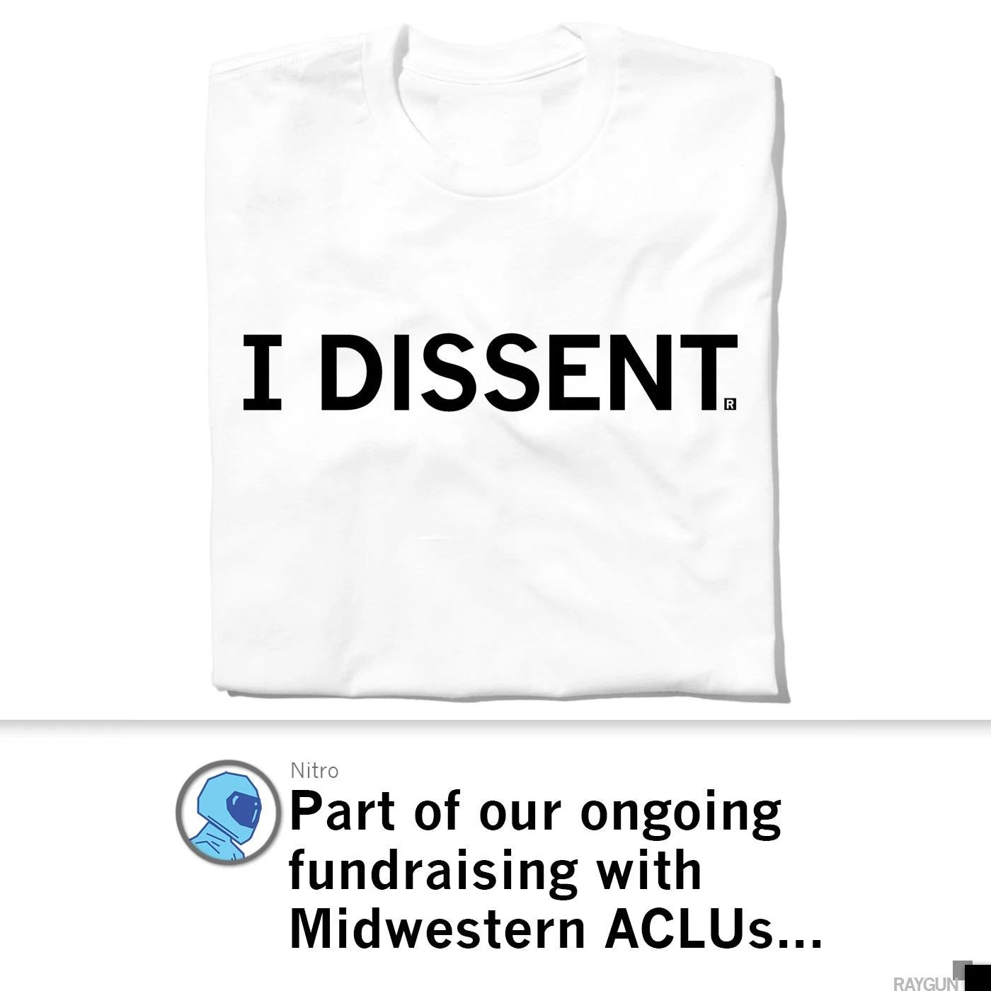 I Dissent. A Portion of sales goes to our ongoing work with the ACLU. Black Screen Print on a White T-shirt (100% Combed Ringspun Cotton). Cut & sewn sweatshop free. Designed and Printed by Union Labor at RAYGUN.