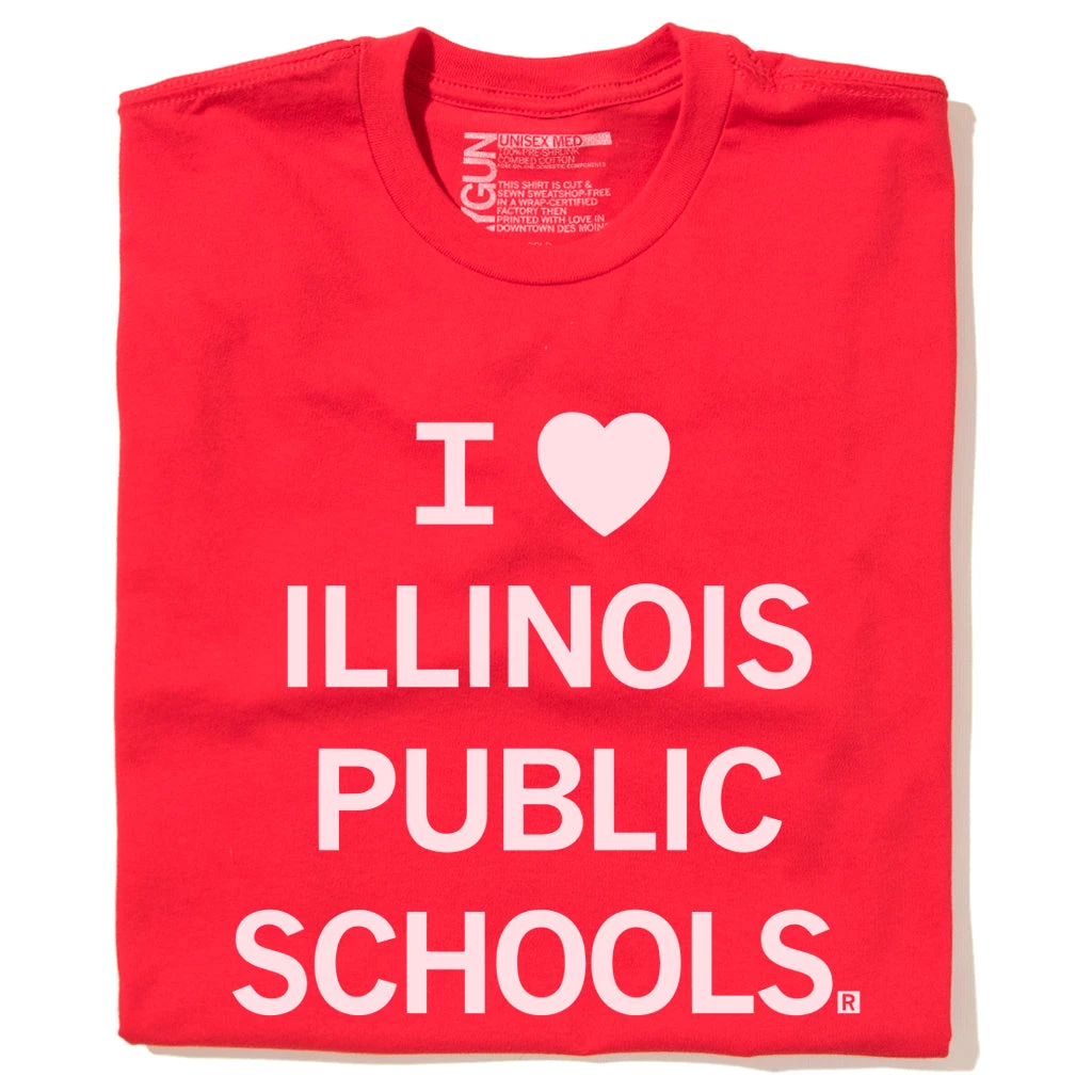 I Heart Illinois Public Schools. This Design Has Been Retired and is No Longer Available on Our Sales Floors But Can Be Ordered Here Online! Since All of Our Retired Designs Are Printed on Demand, Please Allow For a Couple Extra Days Before Shipping RAYGUN has long supported public education, and sales of this shirt will help fund our continuing projects in the public school systems of Des Moines, Iowa City, Cedar Rapids, Chicago, Omaha, Davenport, Cedar Falls and Kansas City areas. White Screen Print on a Red T-shirt (100% Combed Ringspun Cotton). Cut and sewn sweatshop free. Designed and printed by Union Labor at RAYGUN.