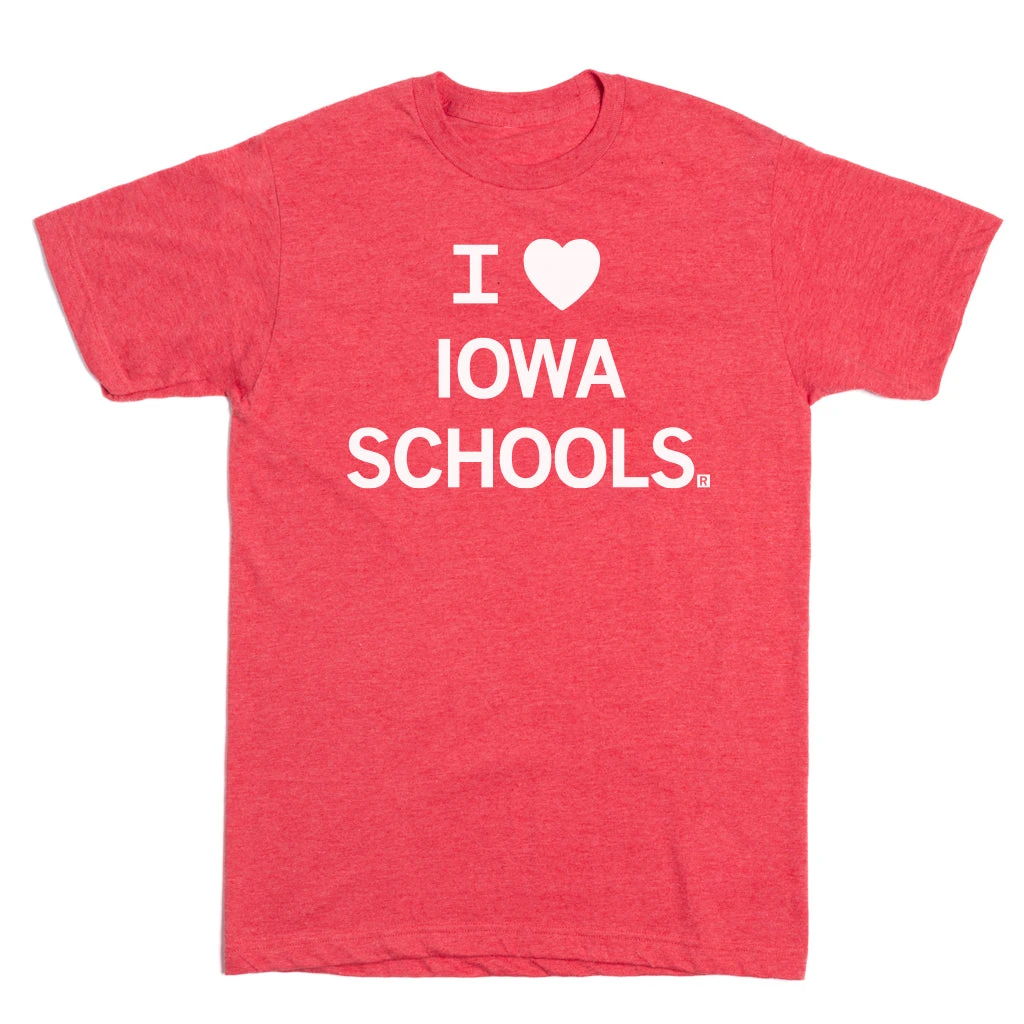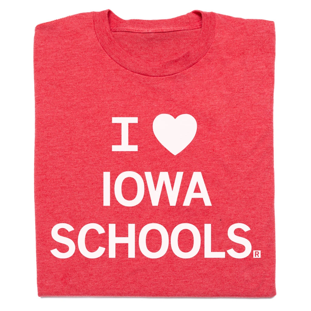 I Love Iowa Schools. A Portion of All RAYGUN Sales Raise Money For Organizations That We Support. White Screen Print on a Heather Red T-Shirt (50% Combed Ringspun Cotton / 50% Polyester). Cut & sewn sweatshop free. Designed and Printed by Union Labor at RAYGUN.