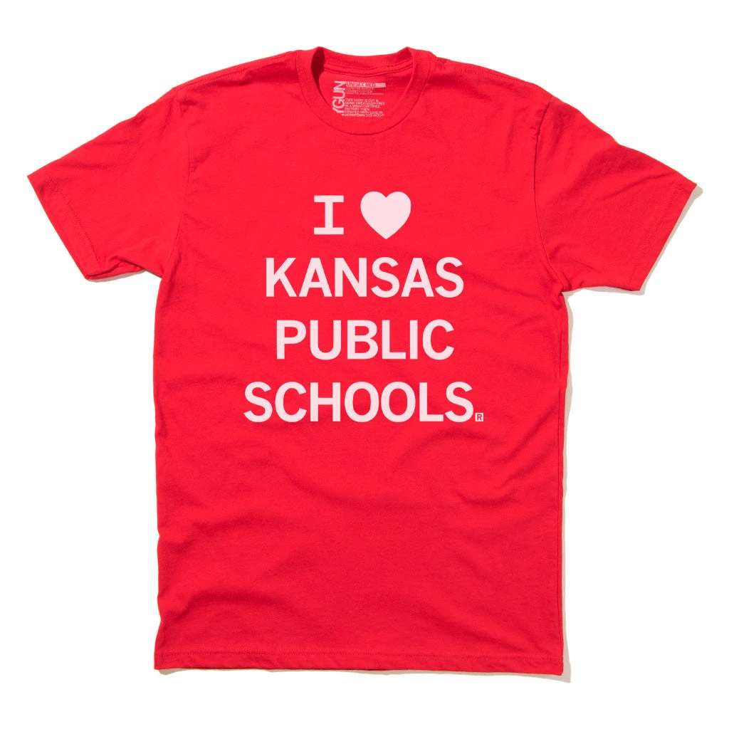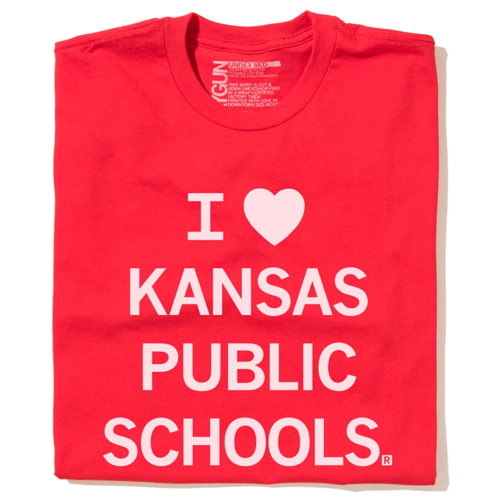 I Heart Kansas Public Schools. RAYGUN has long supported public education, and sales of this shirt will help fund our continuing projects in the public school systems of Des Moines, Iowa City, Cedar Rapids, Chicago, and Kansas City areas. This Design Has Been Retired and is No Longer Available on Our Sales Floors But Can Be Ordered Here Online! Since All of Our Retired Designs Are Printed on Demand, Please Allow For a Couple Extra Days Before Shipping. White Screen Print on a Red T-shirt (100% Combed Ringspun Cotton). Cut and sewn sweatshop free. Designed and printed by Union Labor at RAYGUN.